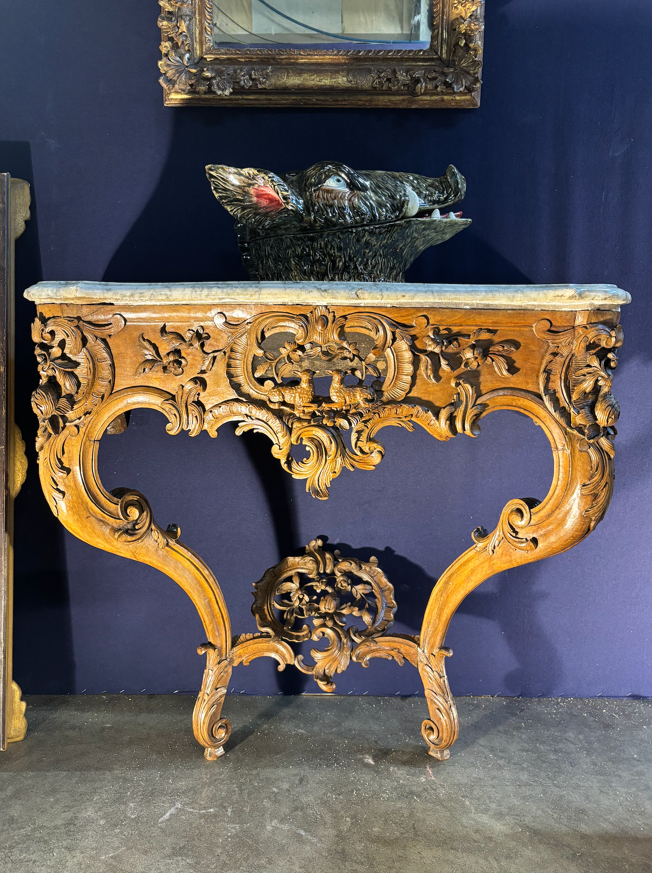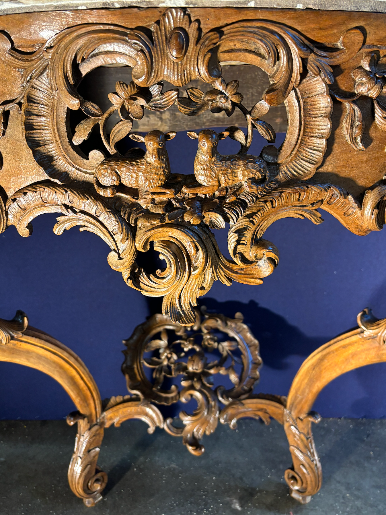 Console d’époque Régence en noyer mouluré et richement sculpté. La ceinture et les montants sont animés d’un décor ajouré de coquilles, fleurettes et rocailles, avec la présence d’agneaux sculptés. Les pieds galbés, au mouvement accentué, sont soulignés de motifs de grenades éclatées et d’enroulements, et sont réunis par une entretoise ajourée à motif rocaille. Plateau de marbre veiné. Dimensions : 87 × 96 × 48 cm.