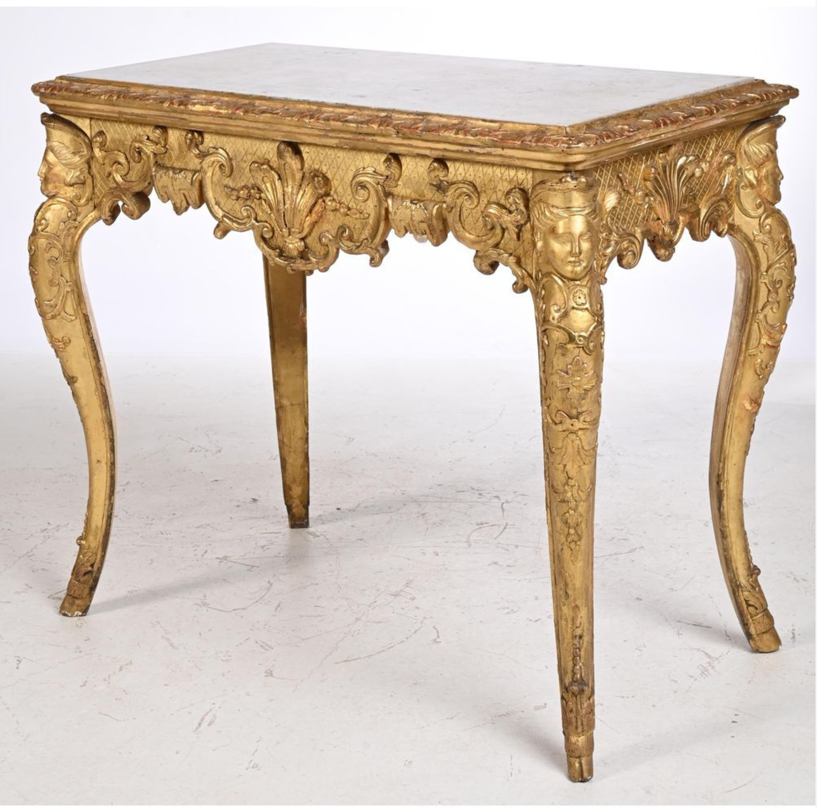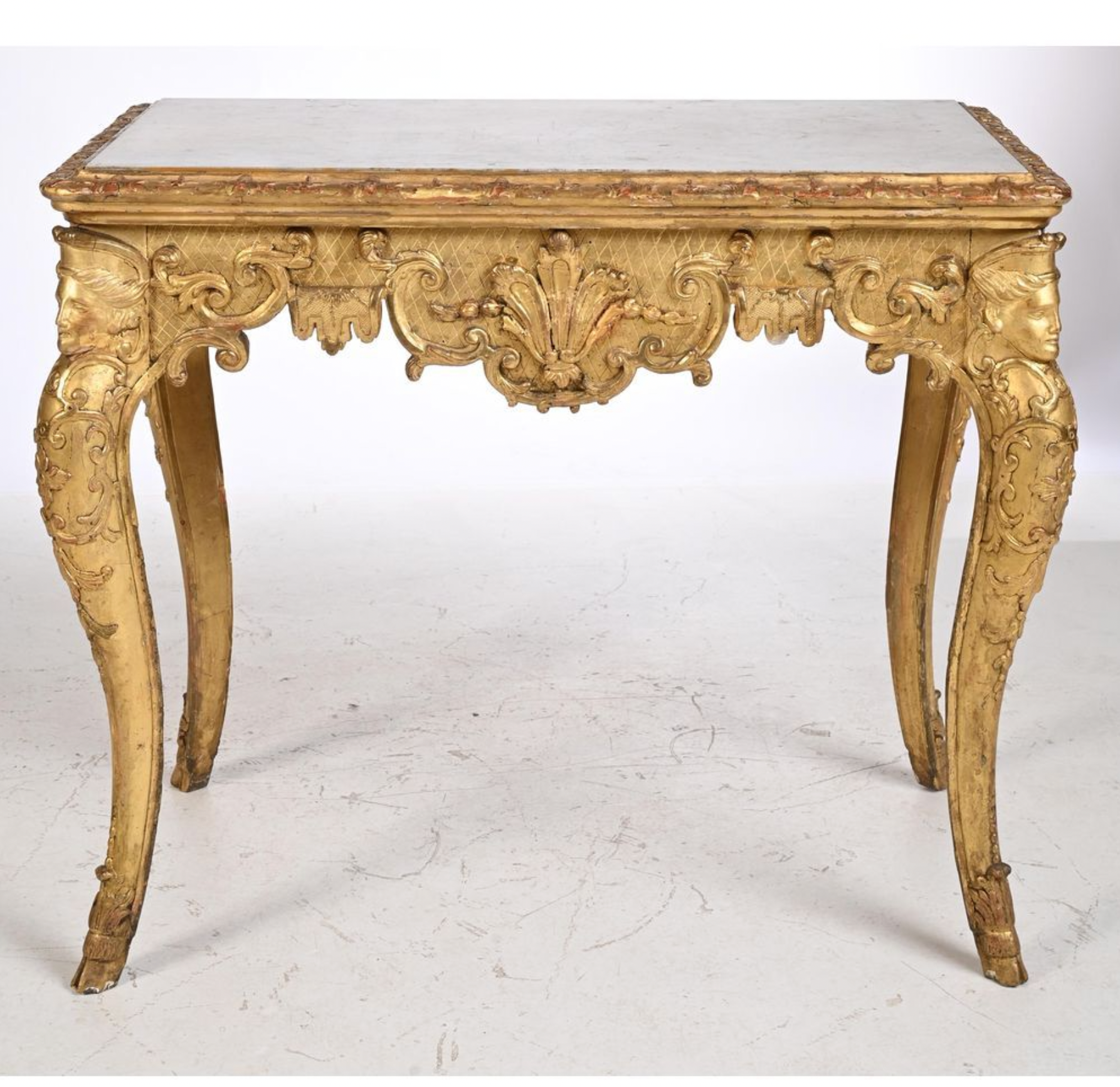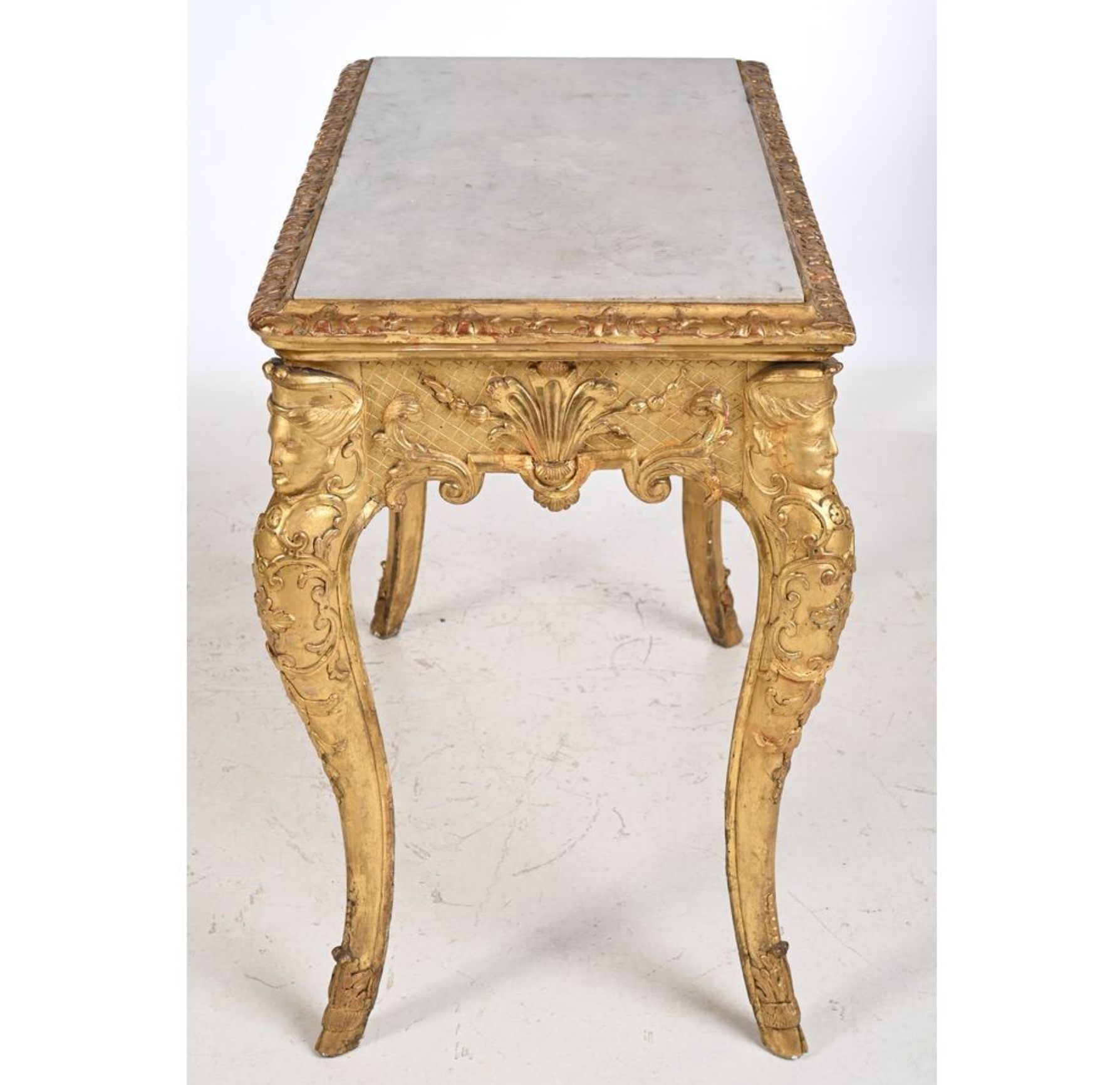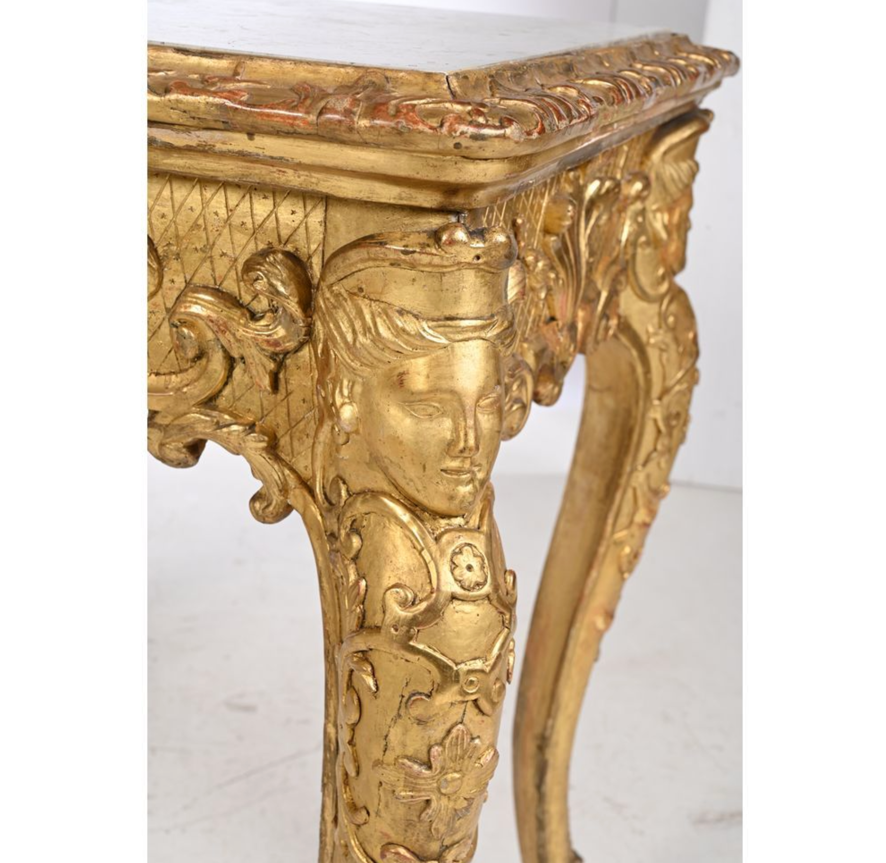 Console Régence de forme rectangulaire en bois doré richement sculpté de têtes de femmes, coquilles, entrelacs et motifs feuillagés. Elle repose sur 4 pieds se terminant par des sabots. Marbre inséré dans le plateau cerclé de bois doré à motifs feuillagés. Ep.XVIIIè. L.95 P.53 H.83.