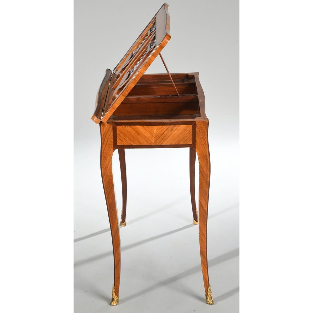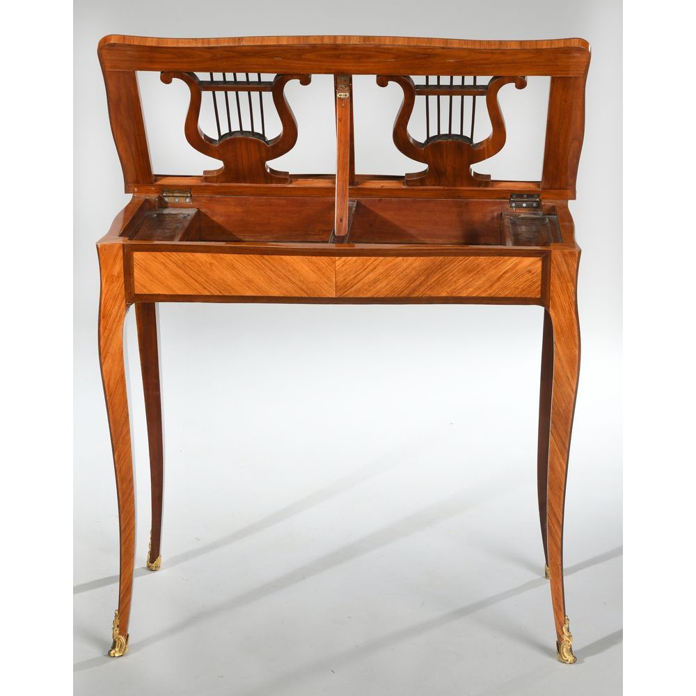 Table de chant Louis XV en placage de bois de rose et d’amarante en encadrement. Le plateau composé de 2 lyres ajourées se soulève pour supporter les partitions. L’intérieur est à double casier. Petits pieds galbés. Estampillée ROUSSEL. Ep.XVIIIè.