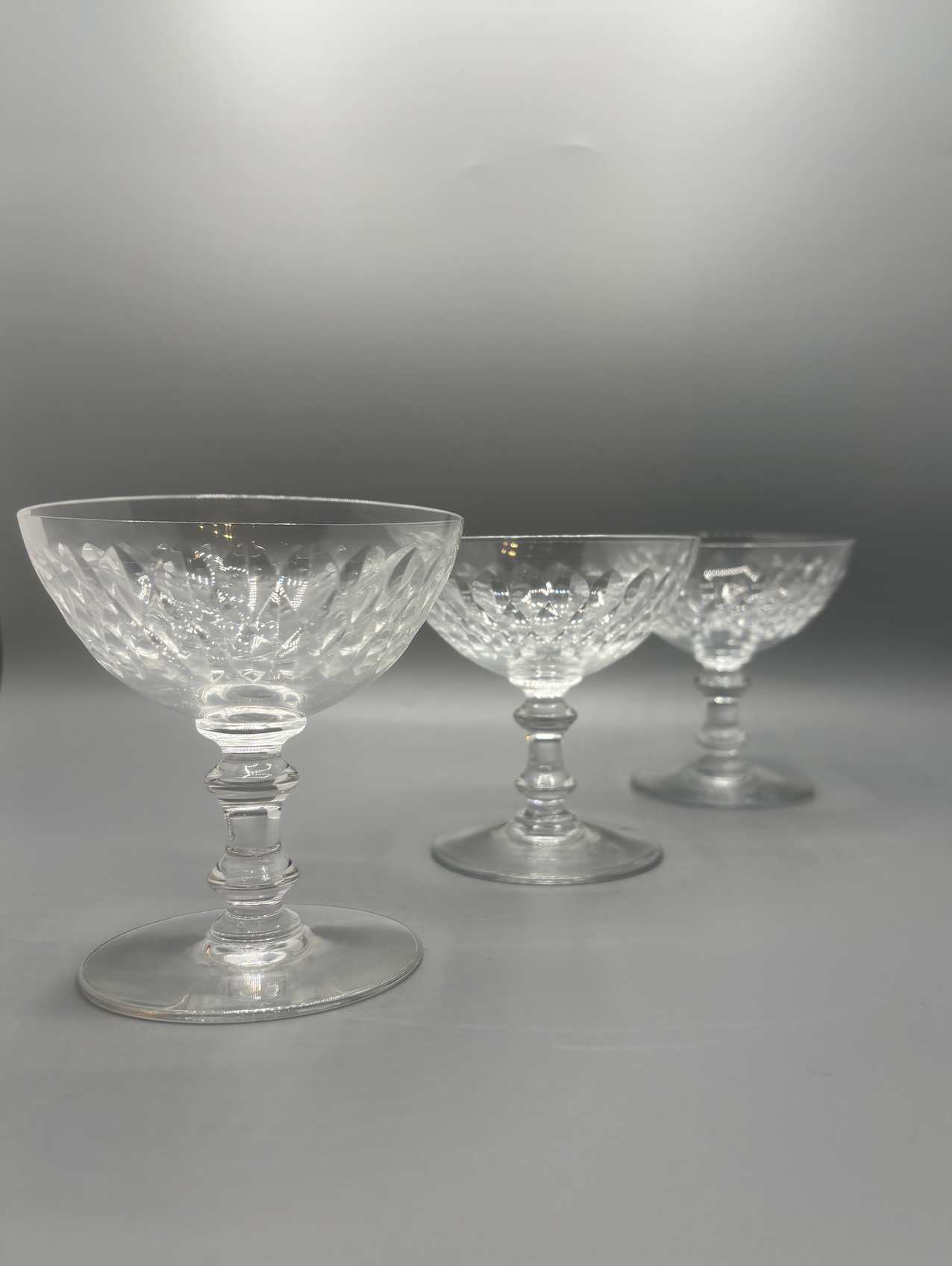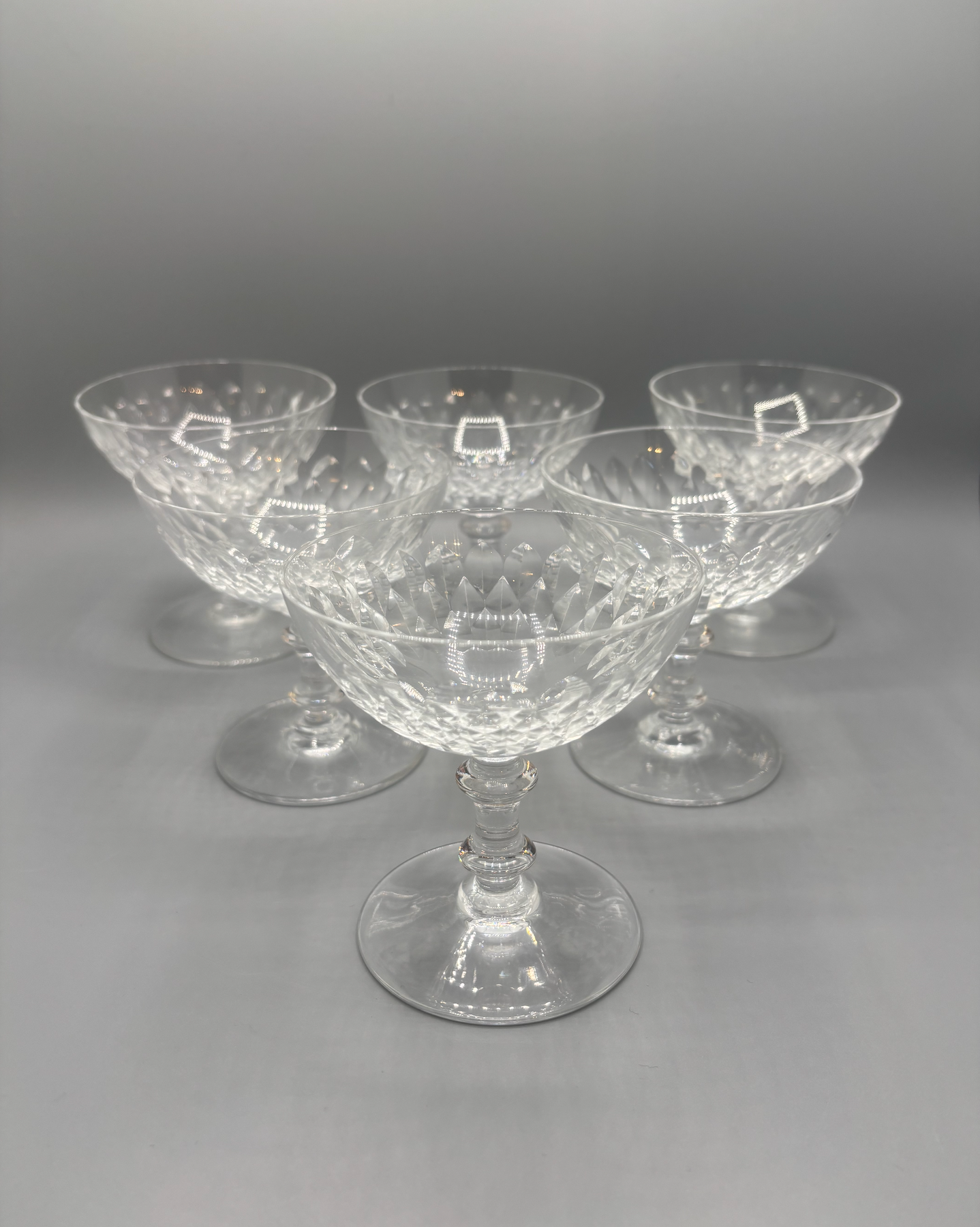 6 coupes à champagne en cristal taillé, à calice évasé orné de pointes de diamant allongées, reposant sur une jambe moulurée et un pied circulaire poli.