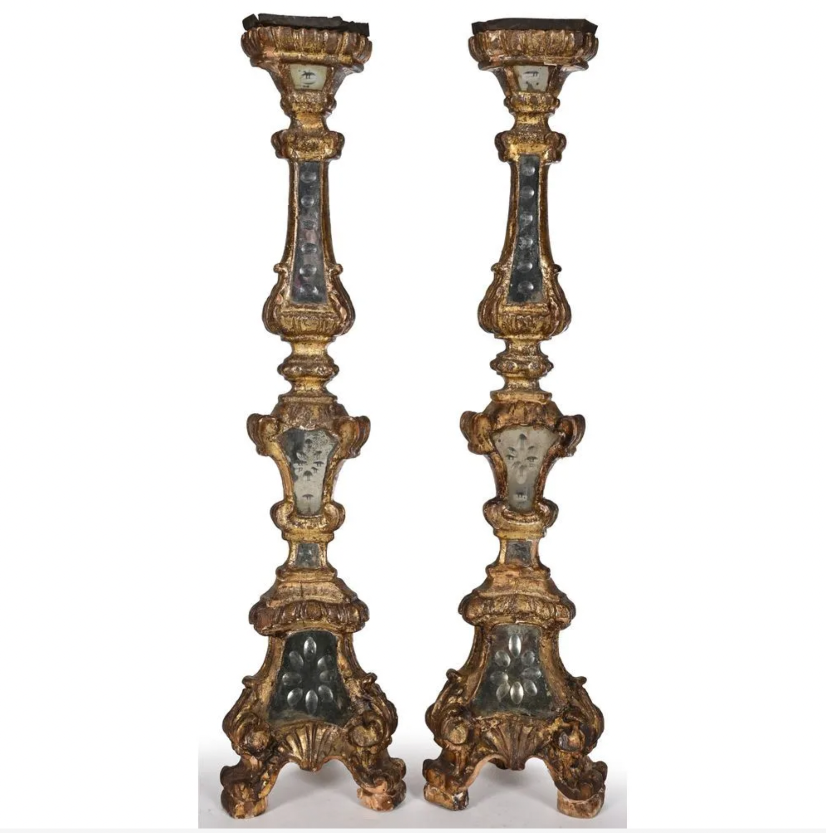 Paire de pique-cierges en bois, stuc doré et verre églomisé à motifs stylisés de fleurs. Ep.XVIIè. H.74.