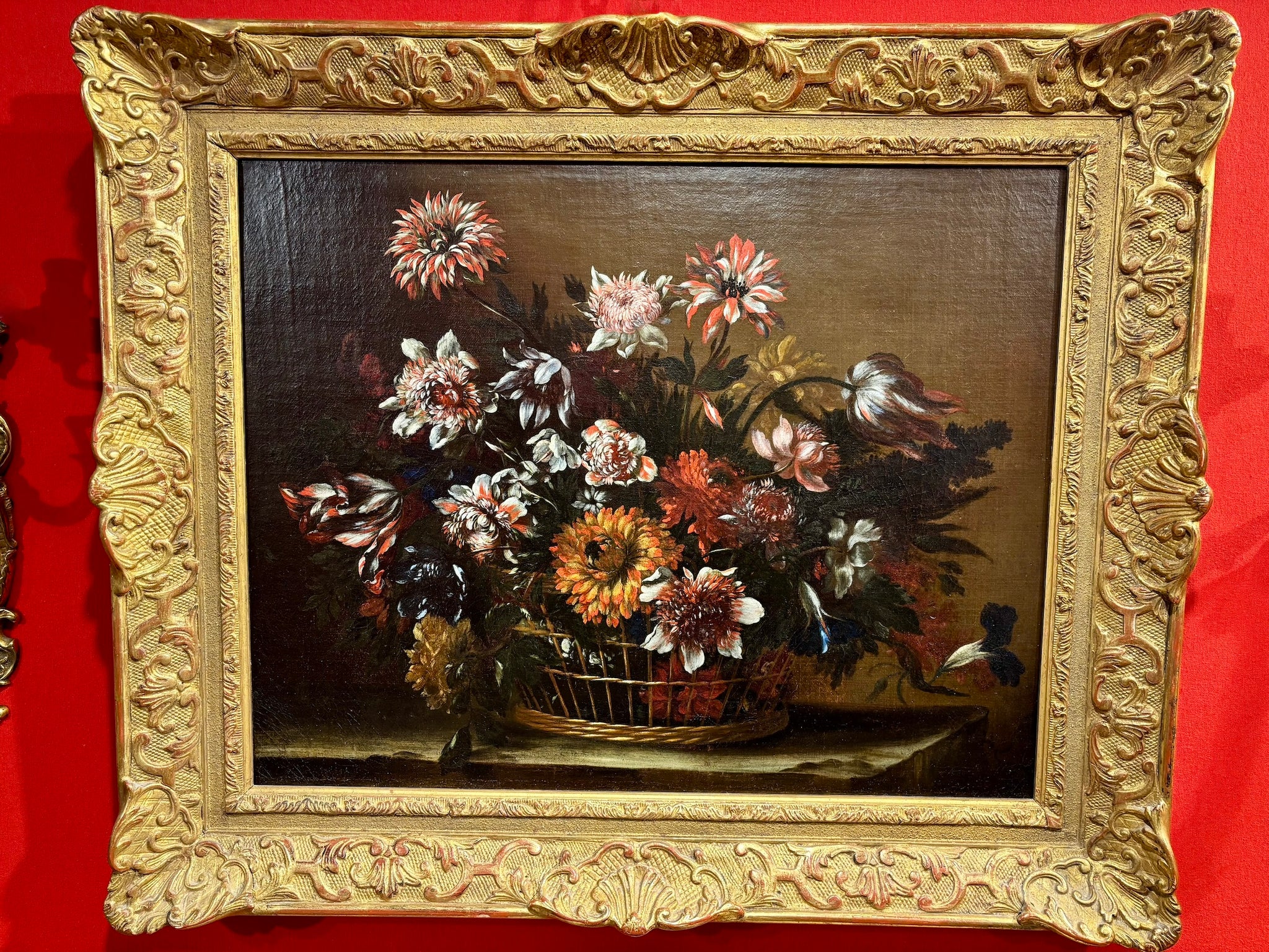 Huile sur toile figurant une corbeille débordante de fleurs de saison, traitées avec finesse dans le modelé des pétales et le rendu des feuillages. Le bouquet se détache sur un fond sombre, accentuant les contrastes de lumière et la profondeur des coloris, tout a fait dans l'esprit des natures mortes françaises du XVIIe siècle. Dimensions : H. 48 cm × L. 60 cm. Expertise Cabinet Turquin