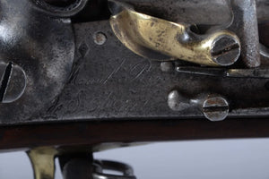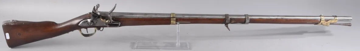 Fusil de dragon modele AN IX à platine à silex fonctionnelle de la Mre Rle de ST ETIENNE, poinçon au S dans un losange de Stelen canon rond daté 1814, crosse en noyer avec fleur de lys et daté aussi 1814, claque de couche et baguette en fer, systeme d'armement fonctionnel. Arme de production de la 1er Restauration