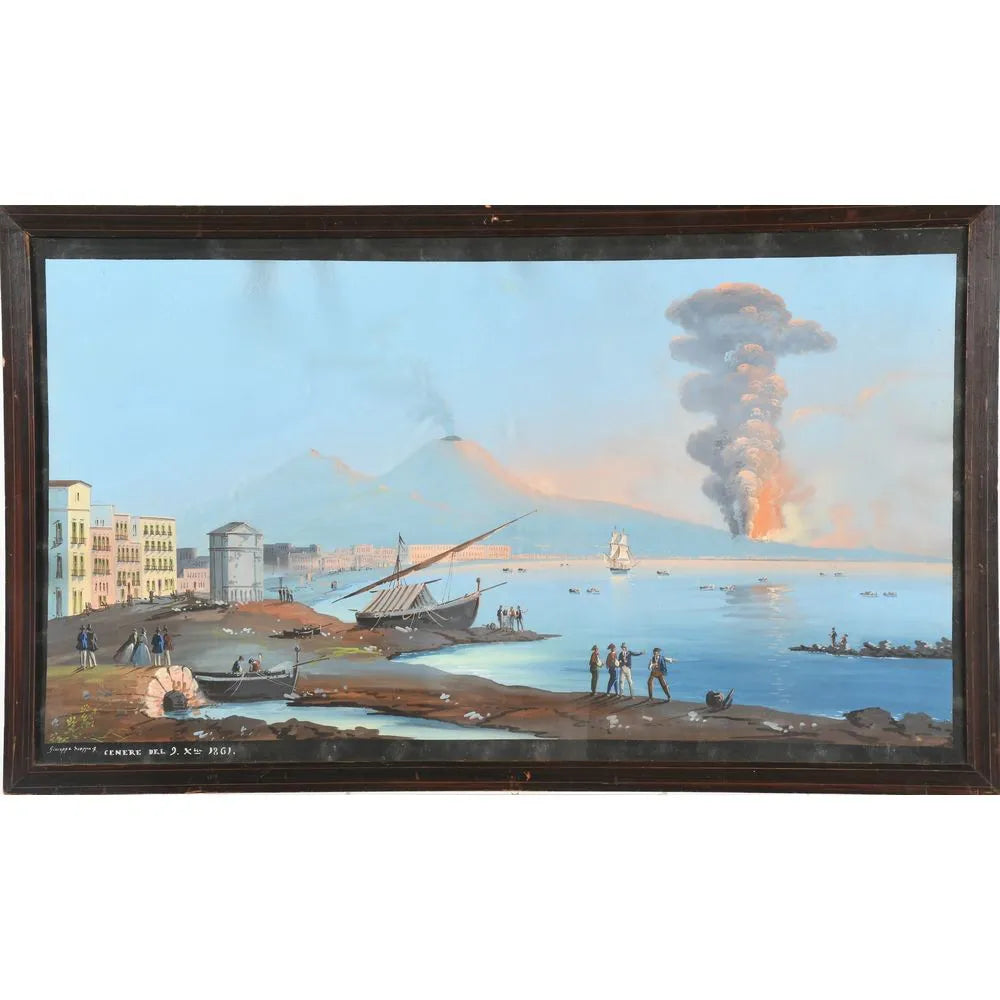 SCOPPA Giuseppe. « Eruption du Vésuve dans la baie de Naples en 1861 ». Gouache signée et datée. H.50 L.86.