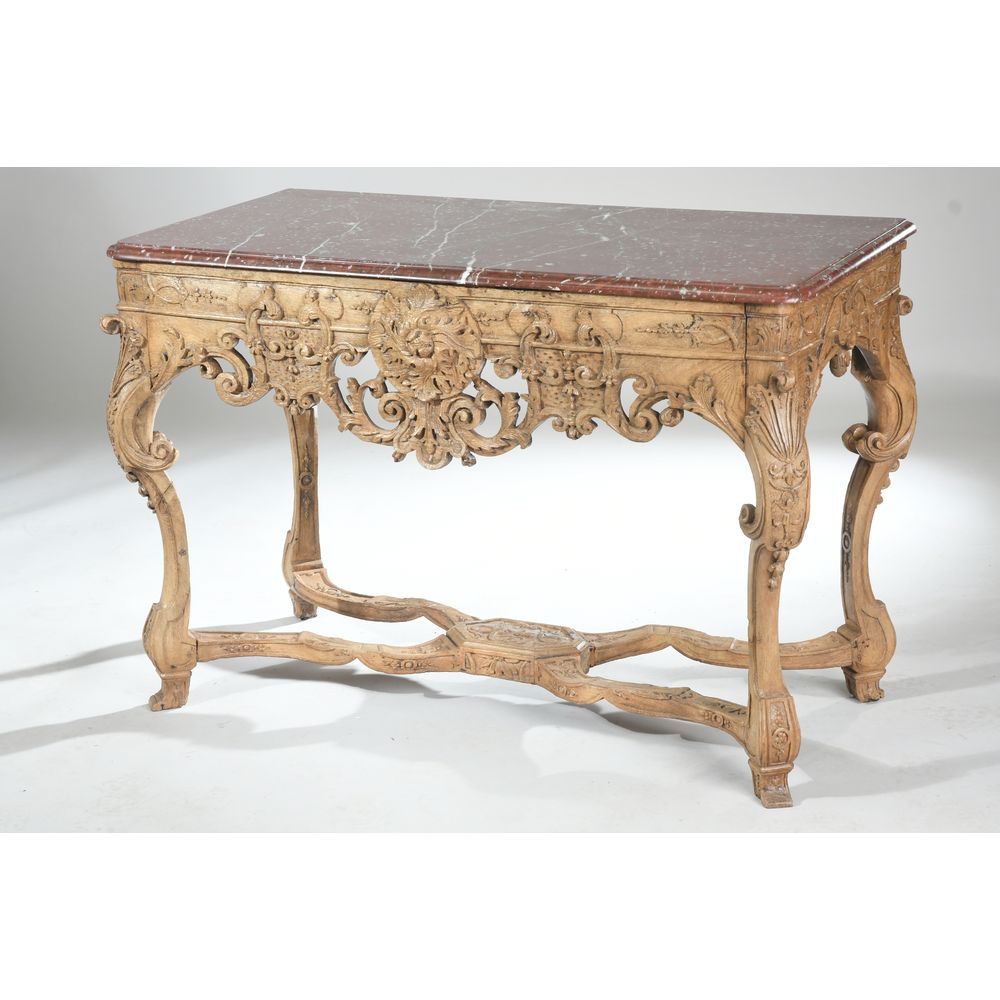 TABLE A GIBIER RÉGENCE en chêne à fine sculpture d’un mascaron central à motifs de quadrifeuilles entouré de guirlandes feuillagées et de motifs à enroulements. Elle repose sur 4 pieds couverts de motifs coquilles et de lambrequins. Ils sont réunis par une entretoise en X à mascarons. Dessus de marbre rouge griotte. Travail parisien vers 1730. L.111 P.57 H.78.