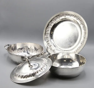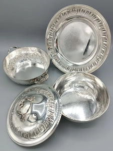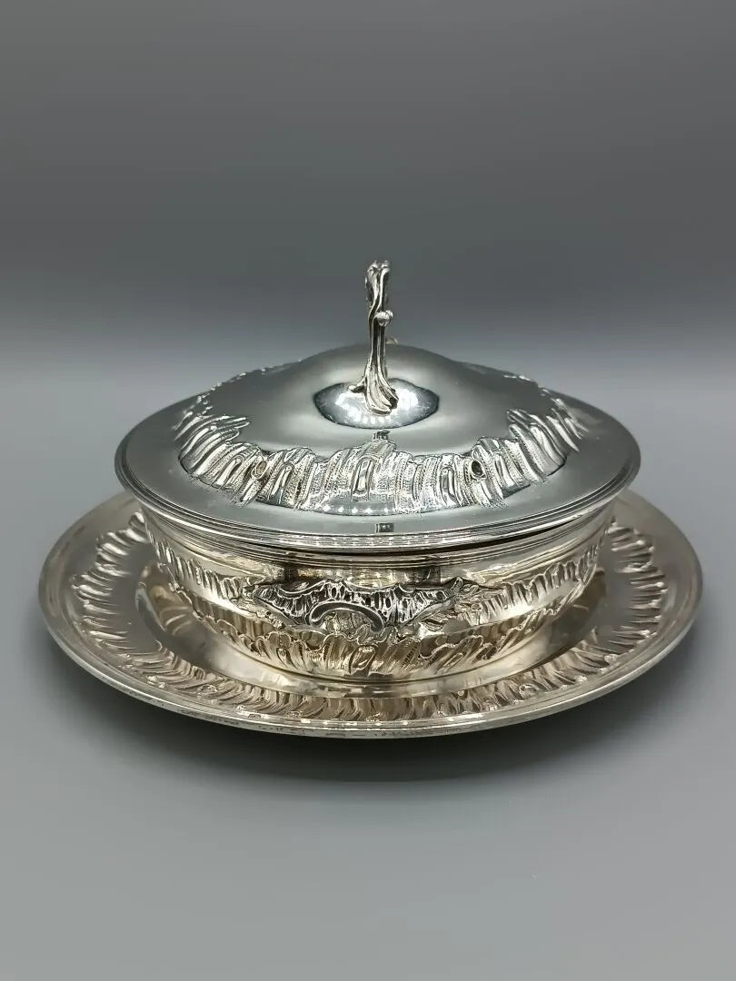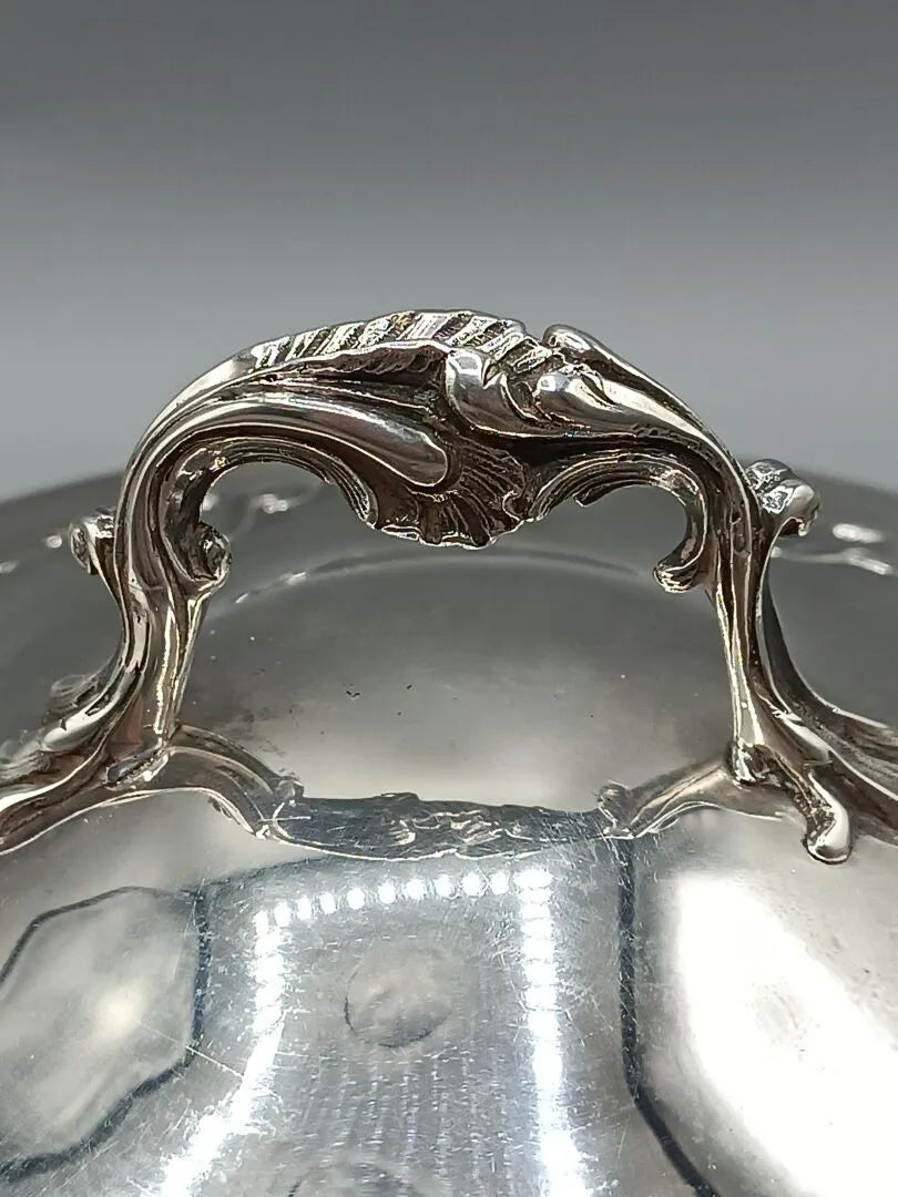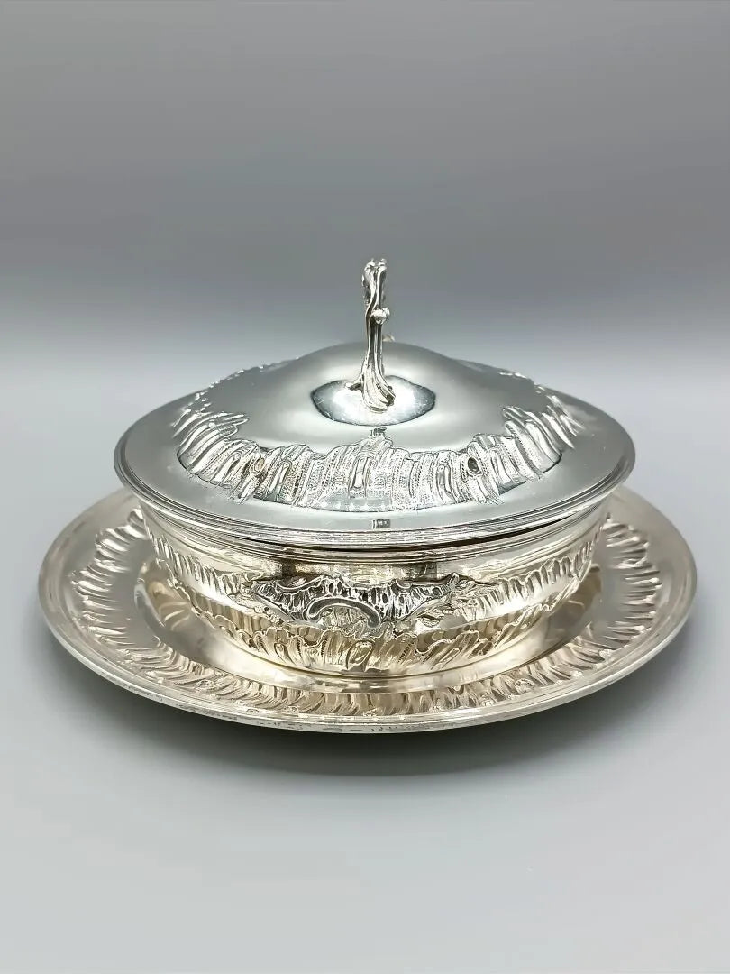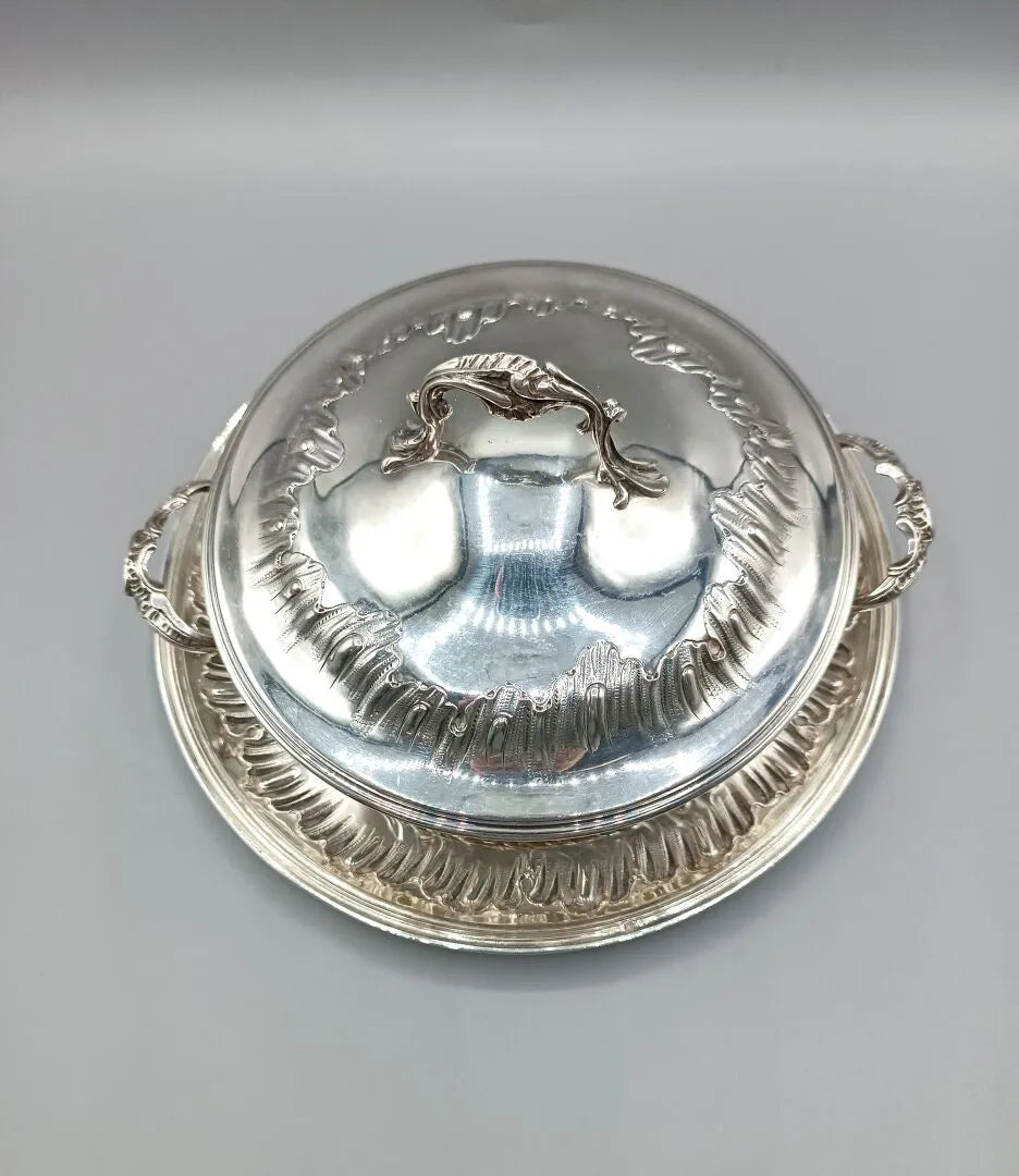 TETARD / LAIGNEZ Légumier couvert en argent de style Louis XV, complet de son intérieur et présentoir. Ensemble en argent à décor de peignées / rinceaux, et poignées / prise du couvercle feuillagées. Poinçons minerve 1er titre (.950). Poinçons des maîtres orfèvres: TETARD Frères et signature en toutes lettres du maître orfèvre "LAIGNIEZ". Diamètre du présentoir : 22 cm. Poids total : 1000 grammes.