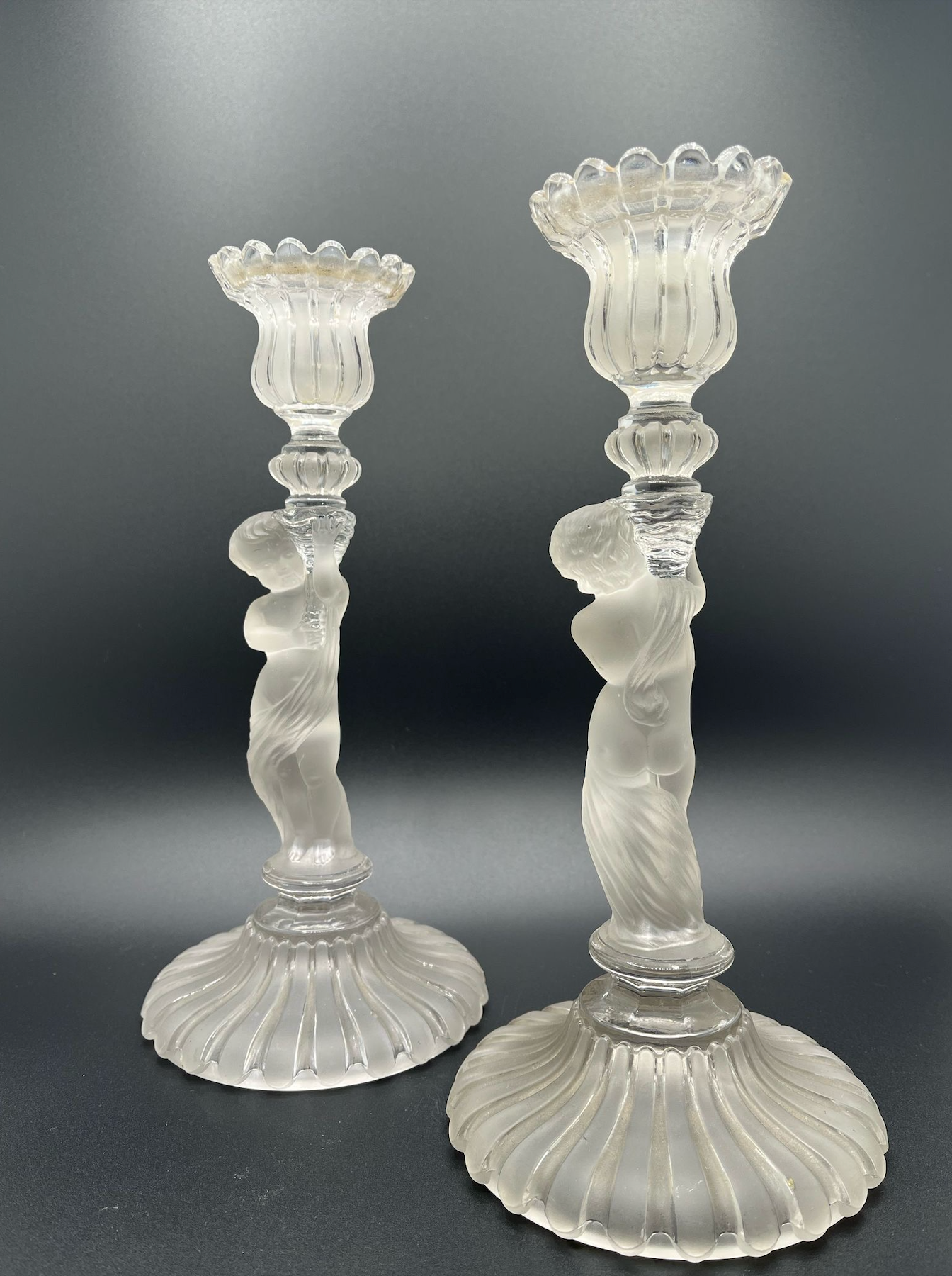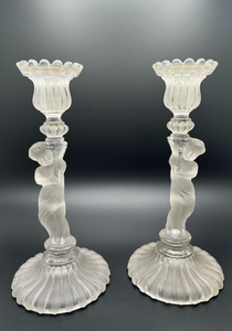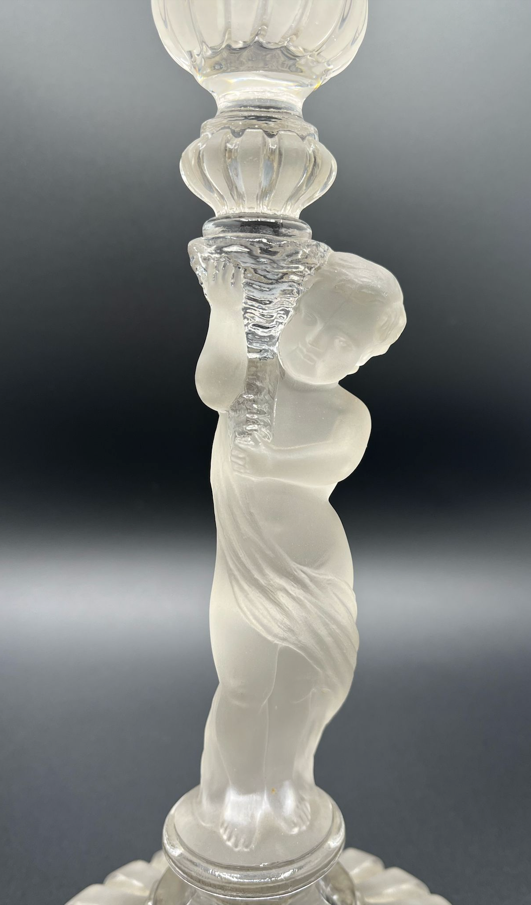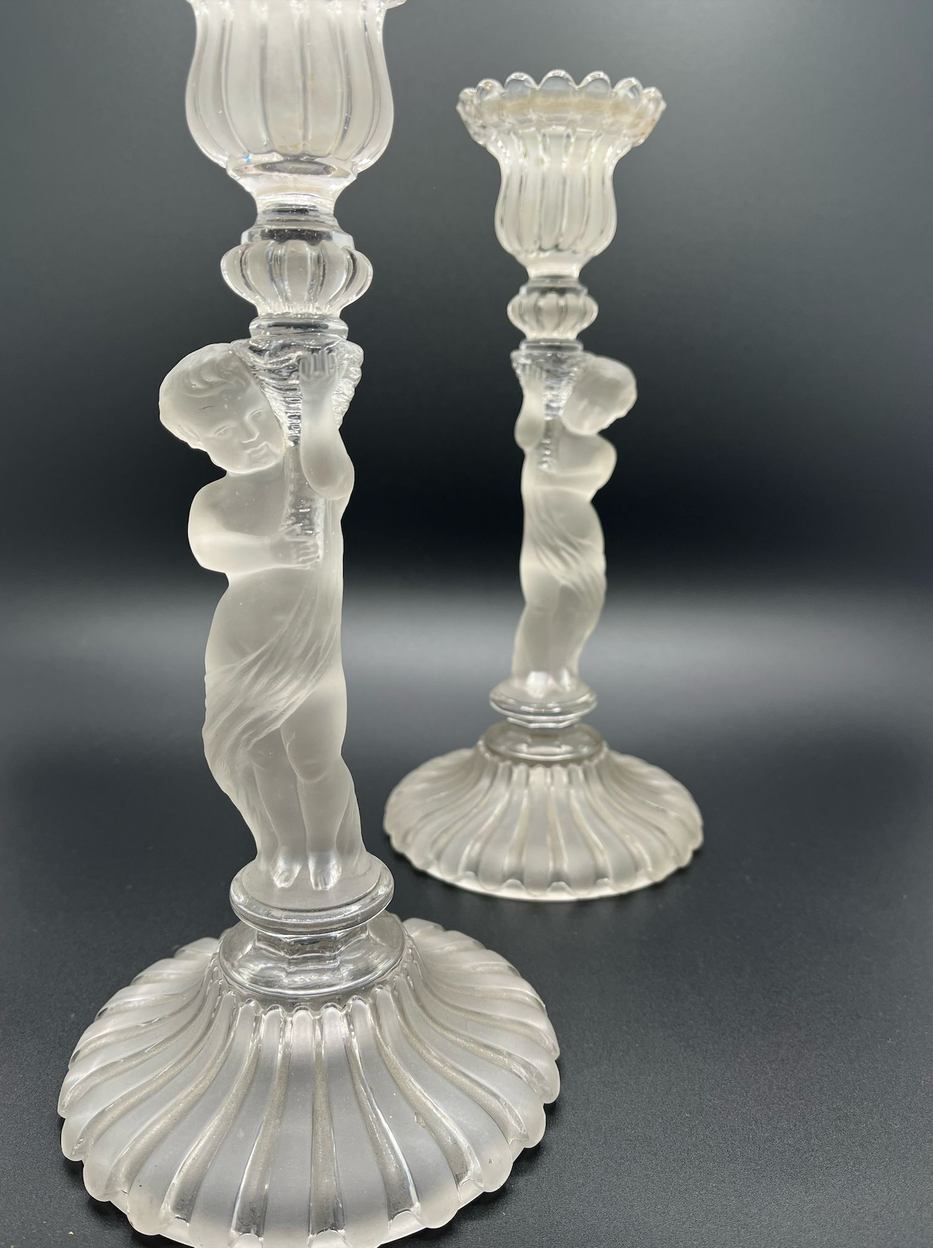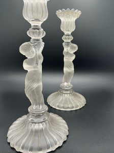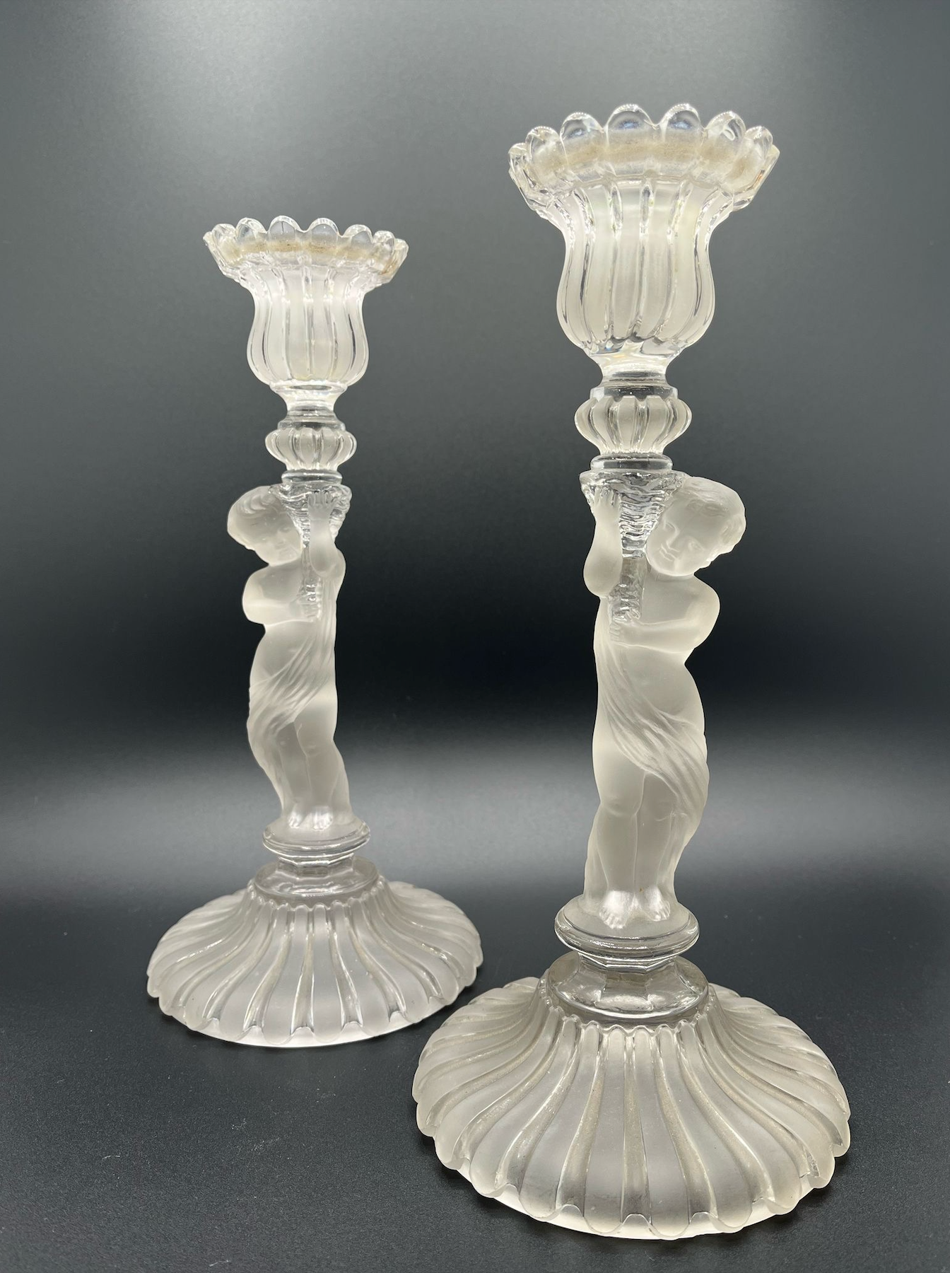 BACARRAT, paire de bougeoirs en cristal à décor de putti et godrons. H 25.5 cm, diamètre de la base 11.5 cm.
