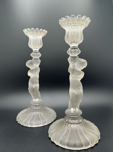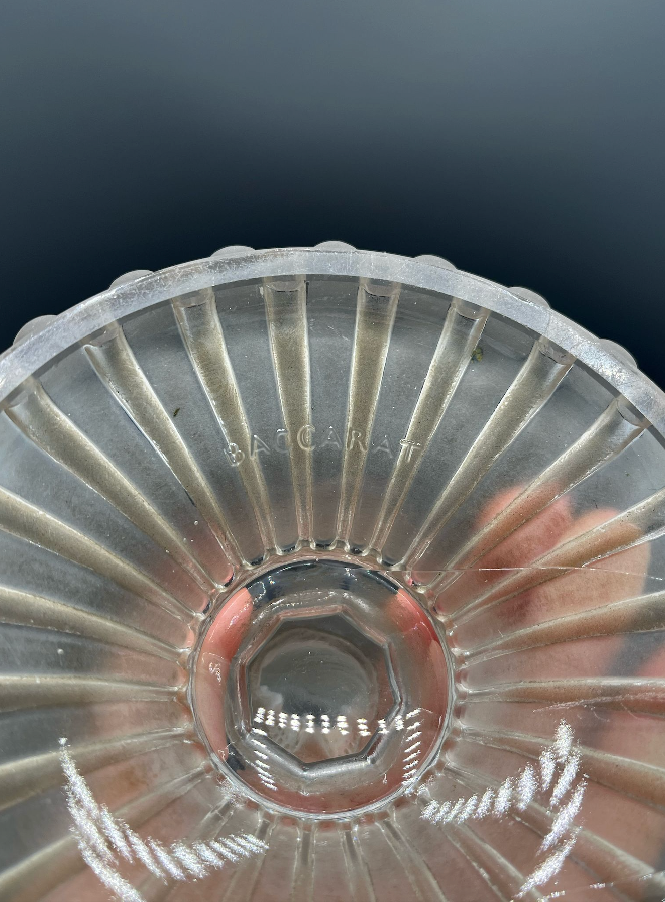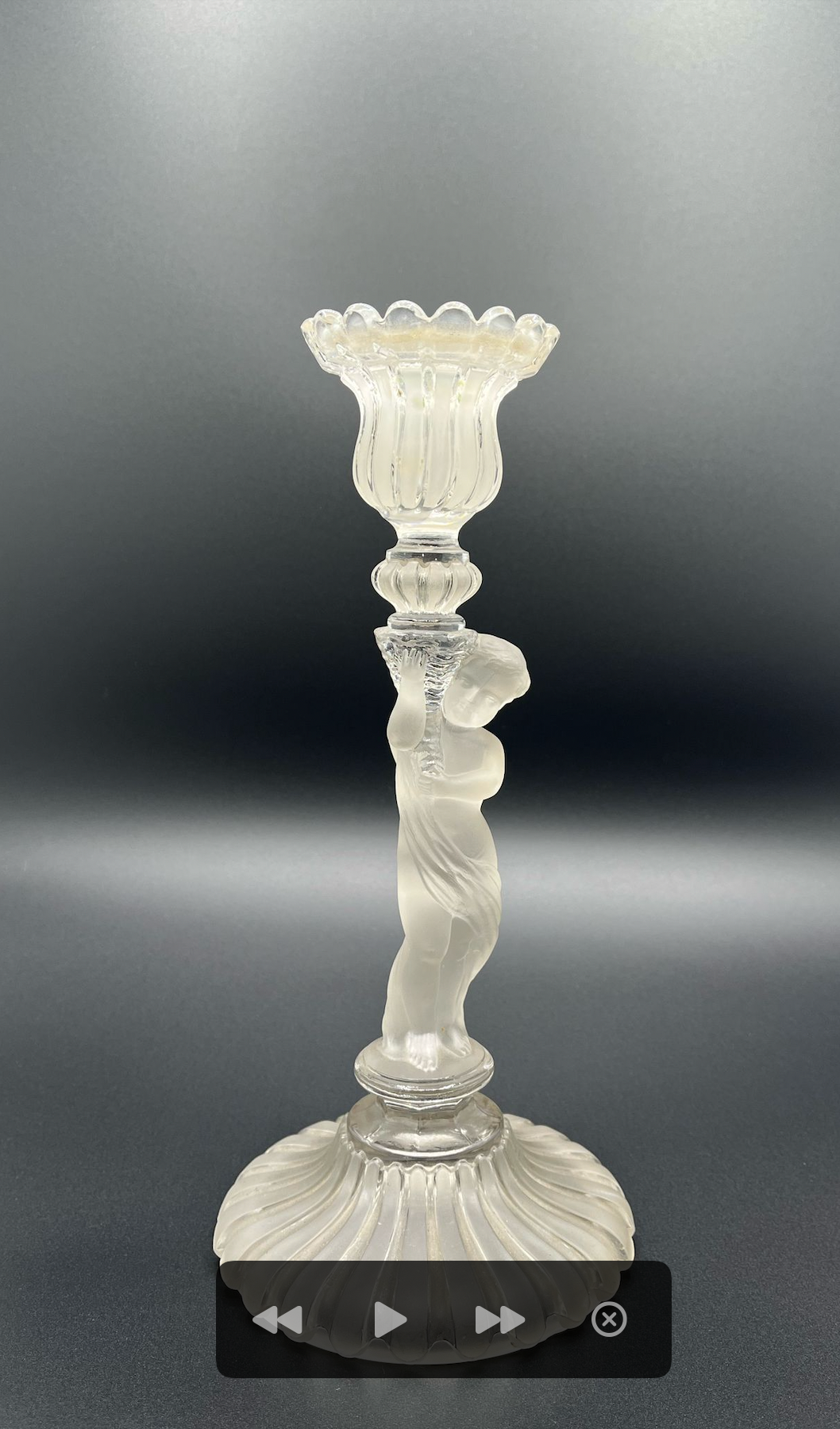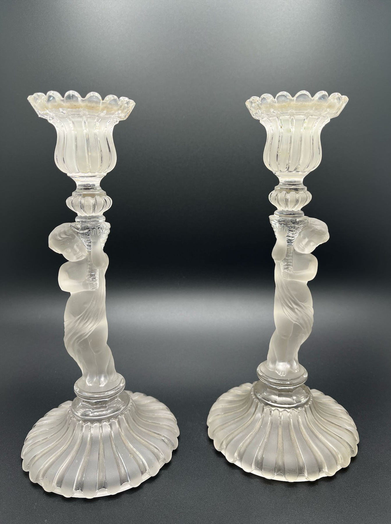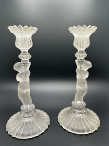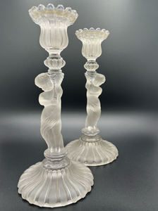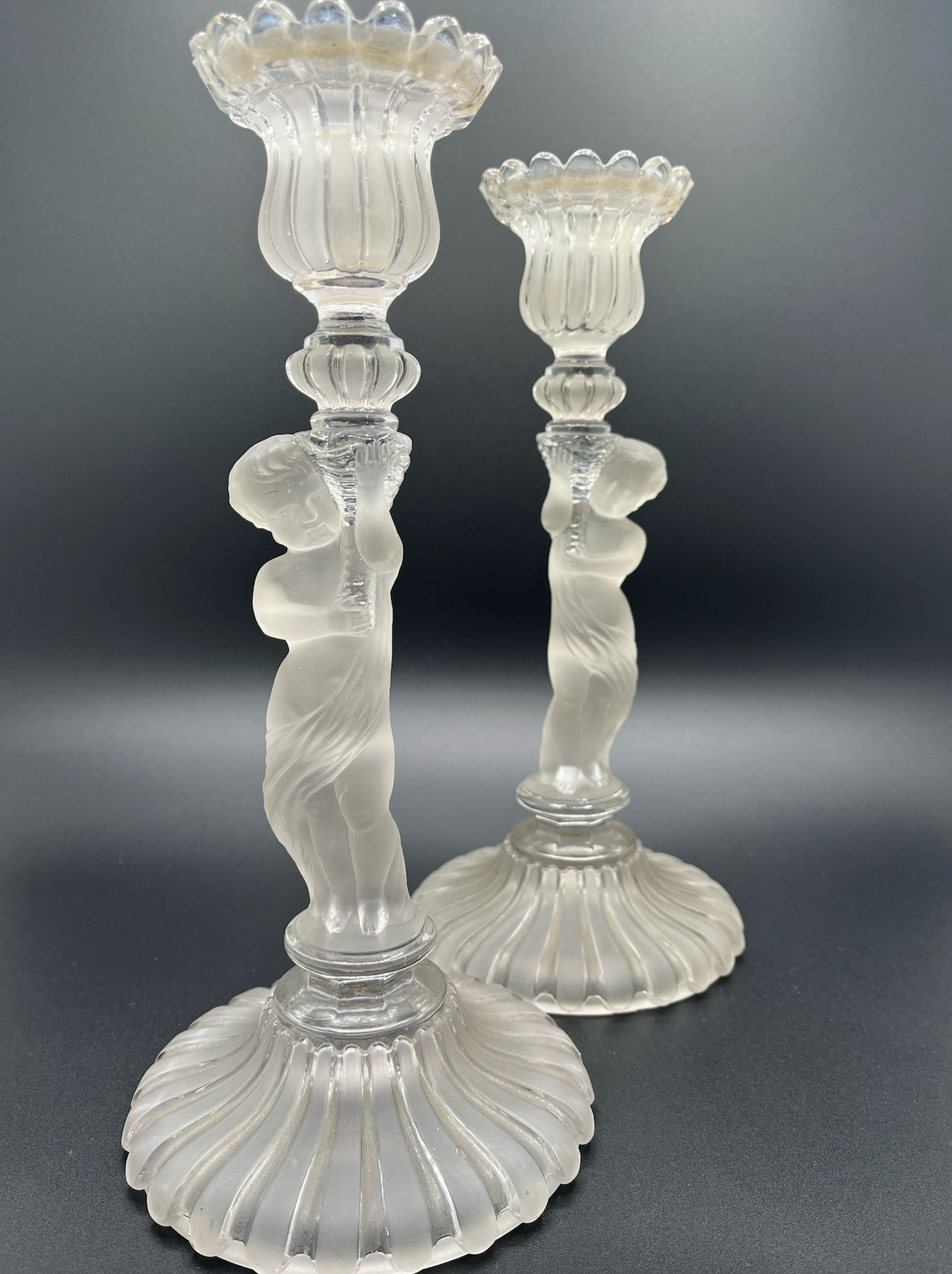 BACARRAT, paire de bougeoirs en cristal à décor de putti et godrons. H 25.5 cm, diamètre de la base 11.5 cm.