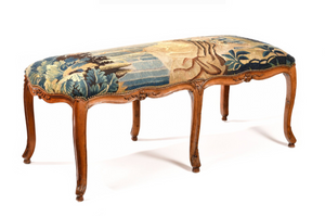 Banquette de service en bois naturel mouluré, sculpté, de forme mouvementée, à décor de fleurs et feuilles, sur six pieds cambrés.