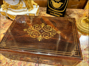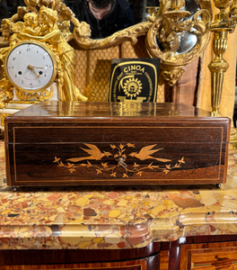 Coffret en marqueterie de bois clair sur fond de placage de palissandre. Décor d'oiseaux et de rinceaux. Epoque XIX. H_10 cm L_32,5 cm P_22,5 cm