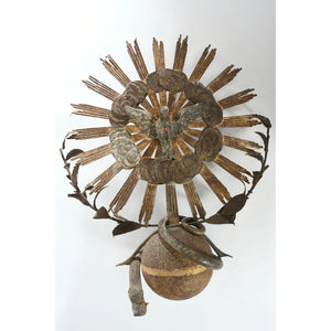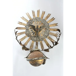 Élément de procession représentant le Saint-Esprit en tôle peinte patinée et dorée. Au centre, une colombe, les ailes déployées entourée d’une nuée et d’un soleil rayonnant reposant sur le monde entouré d’un serpent illustrant le mal. Ep.XVIIIè. H.75 L.61.