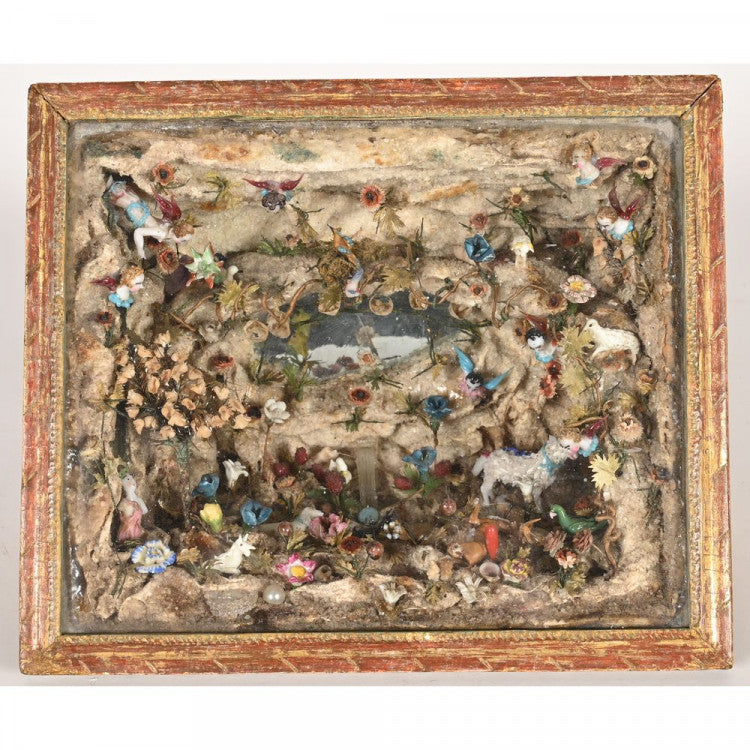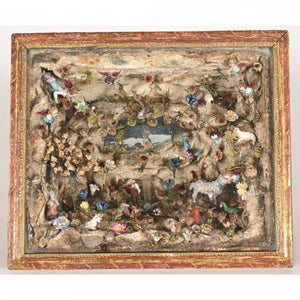 CRECHE DE PARADIS en verre filet de Nevers à riche décor d’animaux, d’éléments rocailleux, d’anges, de fleurs. Ep.début XVIIIè. H.23 L.27 P.16.