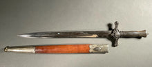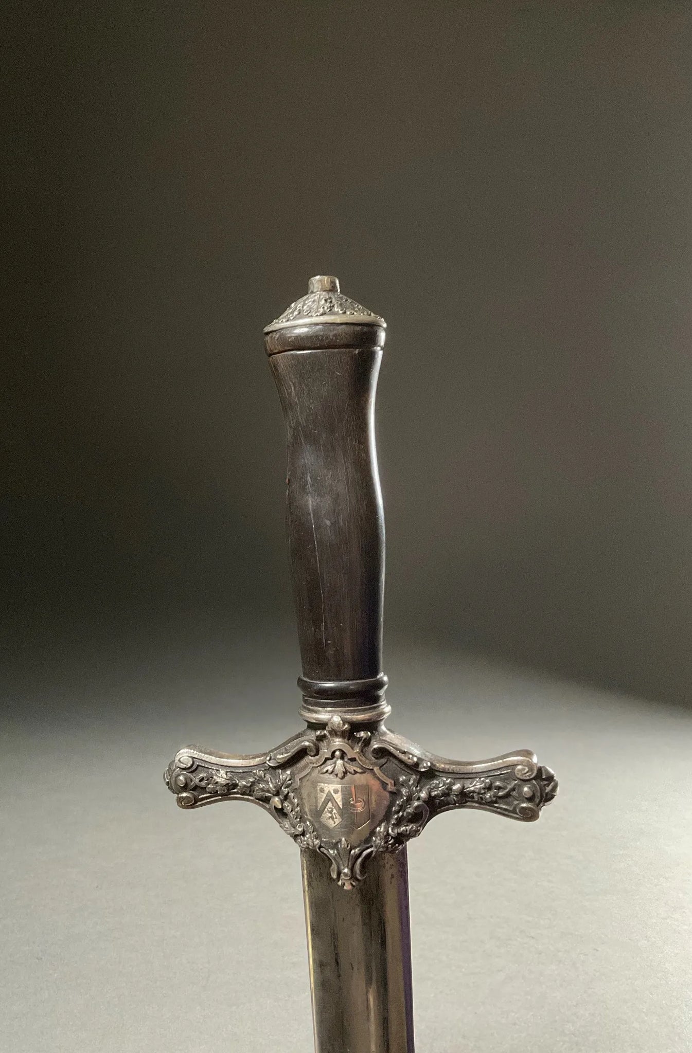 Dague de vénerie. Manche en corne. Monture en laiton, ciselé, argenté. Pommeau décoré de feuilles de chêne. Garde à deux quillons droits, à décor de feuillages. Nœud de corps au cor sur le devant, de deux blasons accolés sur l’arrière. Lame à deux tranchants et gouttières dissymétriques. Fourreau en cuir, à deux garnitures en métal, découpé, gravé, argenté.