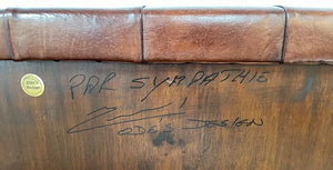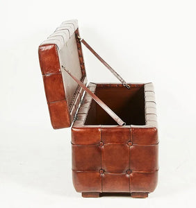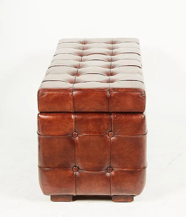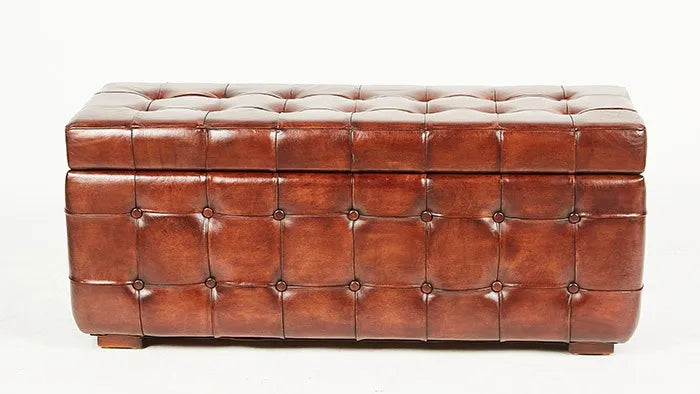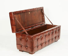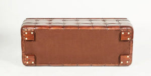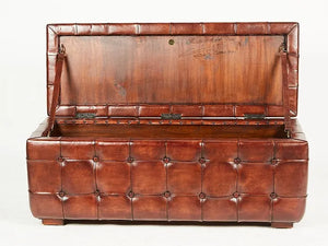 DE SCHRIJVER Olivier (né en 1958). Ecole Belge. Banquette coffre "Jack" en cuir brun capitonné style Chesterfield. Comme chez vous edition ode design. Signée "Par sympathie". Haut. : 50 cm. Long. : 120 cm. Prof. : 46 cm.