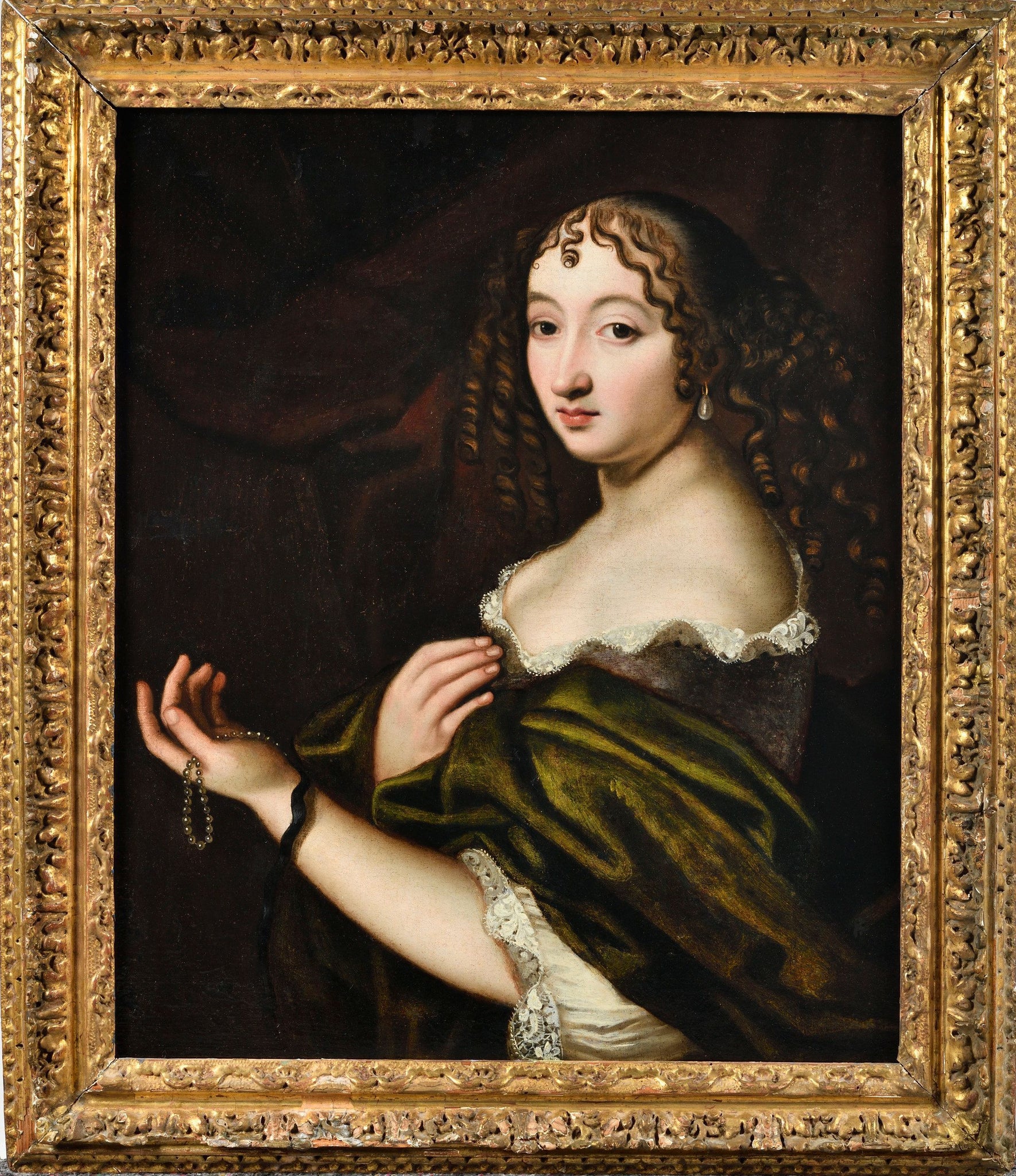 ECOLE Flamande VERS 1650 Portrait de dame au collier de perles Huile sur Toile , superbe cadre en bois doré d'origine