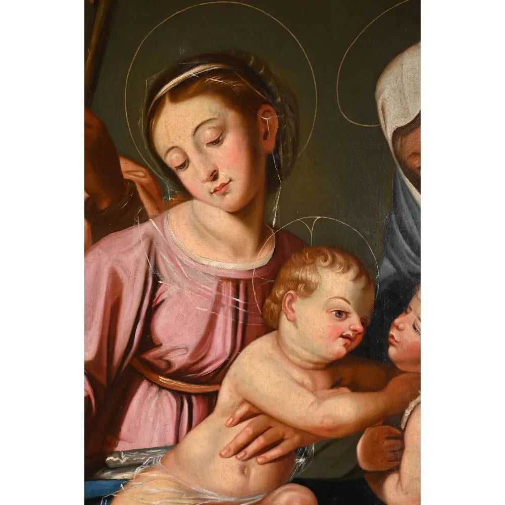 ÉCOLE ITALIENNE du XVIIè. D’après Scipion Pulzone. « La Sainte Famille avec Sainte Anne et Saint Jean ». Grande huile sur toile. H.130 L.106.