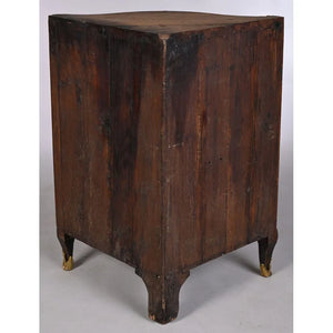 Belle encoignure Louis XV en placage de bois de rose, de bois de violette et de bois de bout d’olivier. Elle ouvre par 2 portes violonées et galbées à décor d’une marqueterie de guirlandes feuillagées et fleuries. Elle repose sur 4 pieds. Ornementation de bronzes dorés. Trace d’estampille. Poinçon de Jurande. Dessus de marbre brèche d’Alep. Ep.XVIIIè. L.80 P.57 H.93.