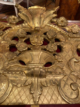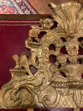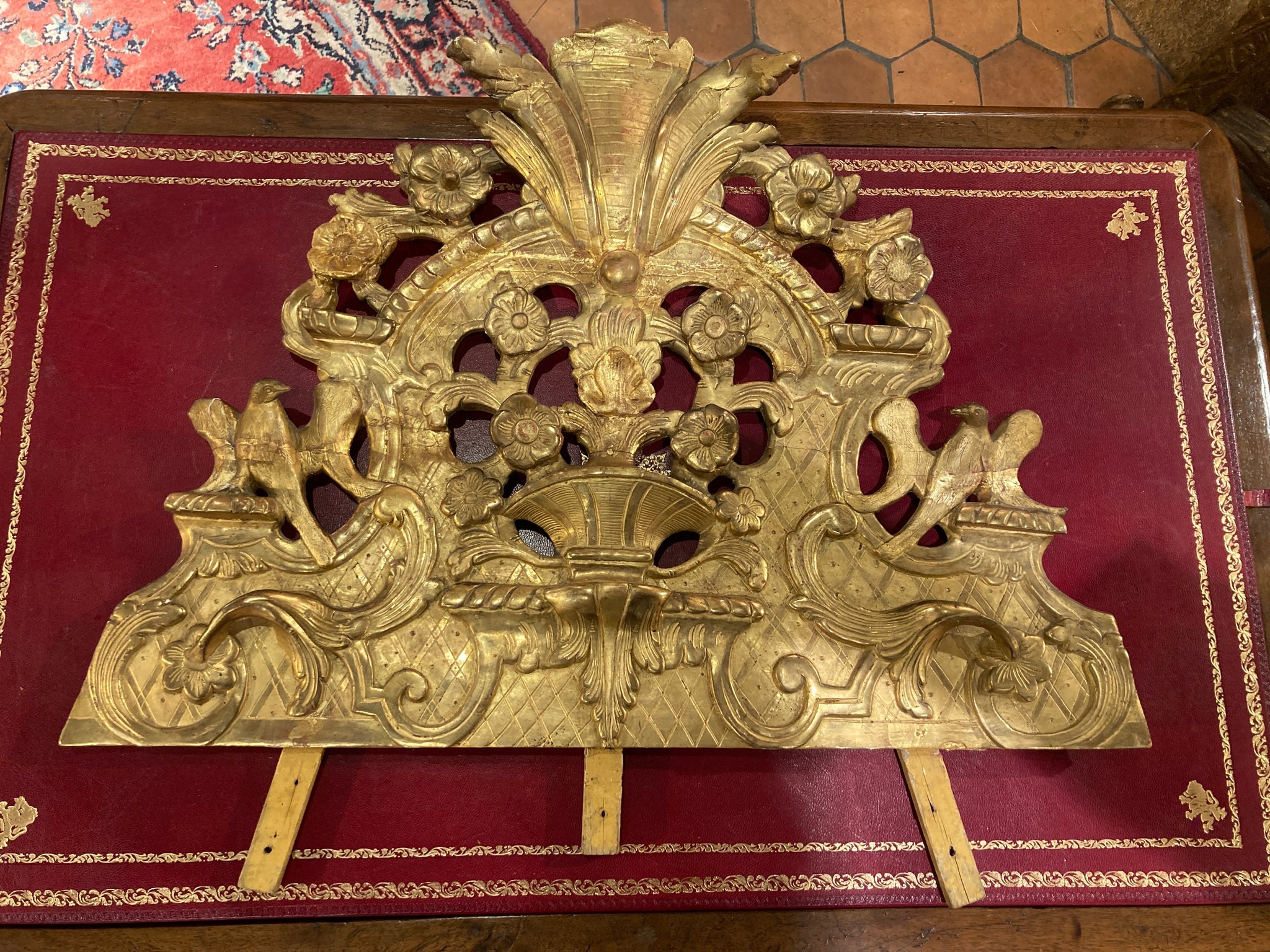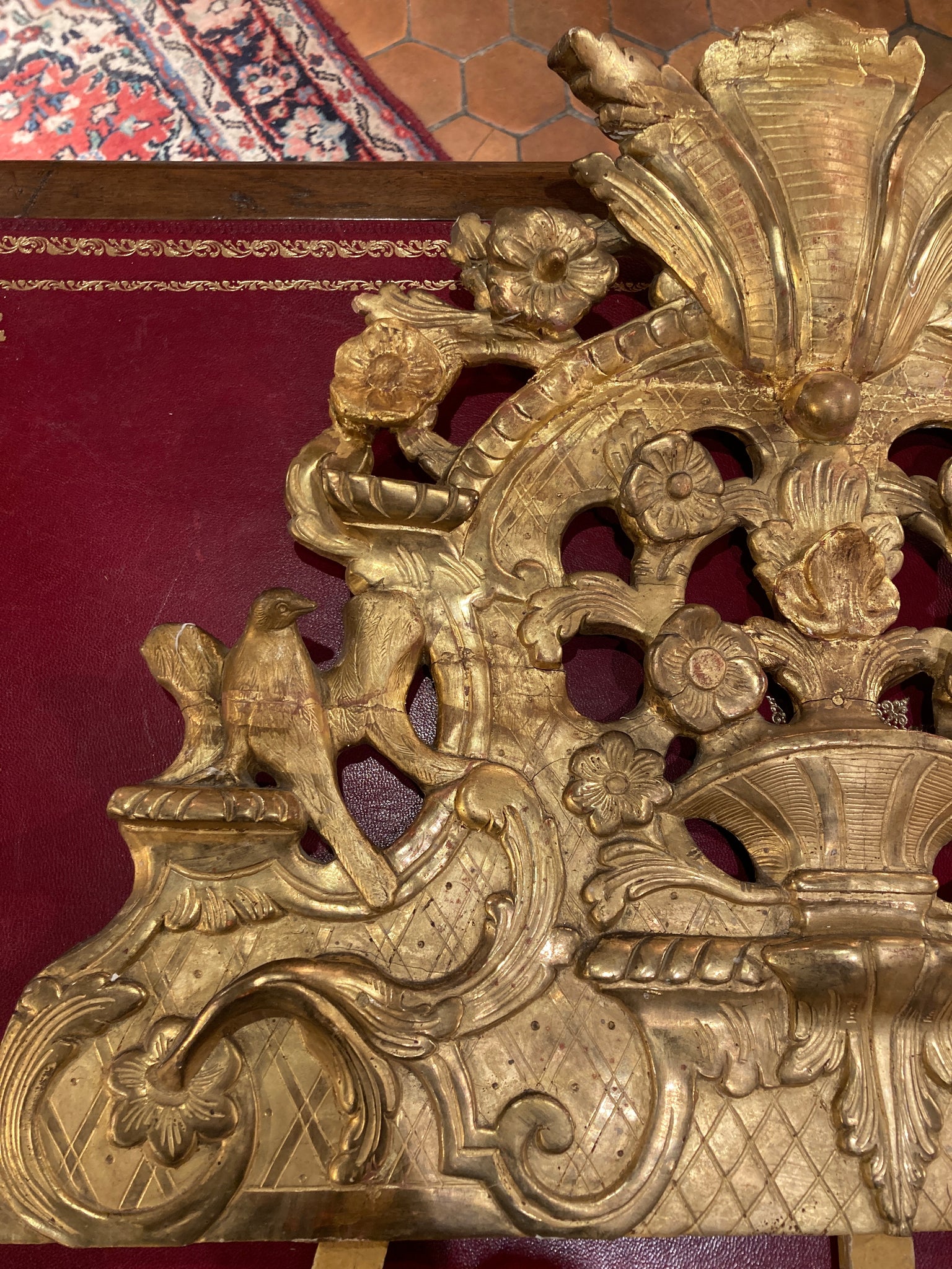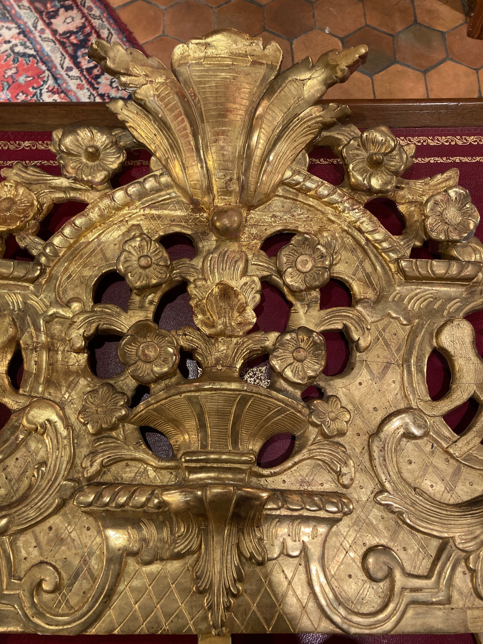 Grand fronton de miroir en bois sculpté et doré à la feuille d'or richement décoré. D'époque Régence.