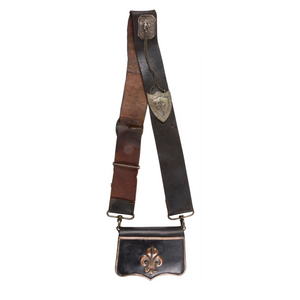 Giberne d’officier de la Garde Nationale.  Coffret recouvert de maroquin noir. Côtés, jonc et motif à la fleur de lys en cuivre argenté. Banderole en cuir noir. Motif au lys, lion et garnitures en cuivre argenté. Epoque Restauration.