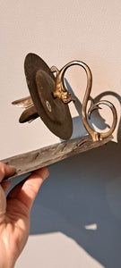 Rare paire d'appliques Henri IV en tôle et laiton martelé et patiné à décor de visages de femmes entourés d’enroulements feuillagés et de motifs coquilles. Ep.fin XVIè début XVIIè. H.35 L.20 P.14.