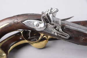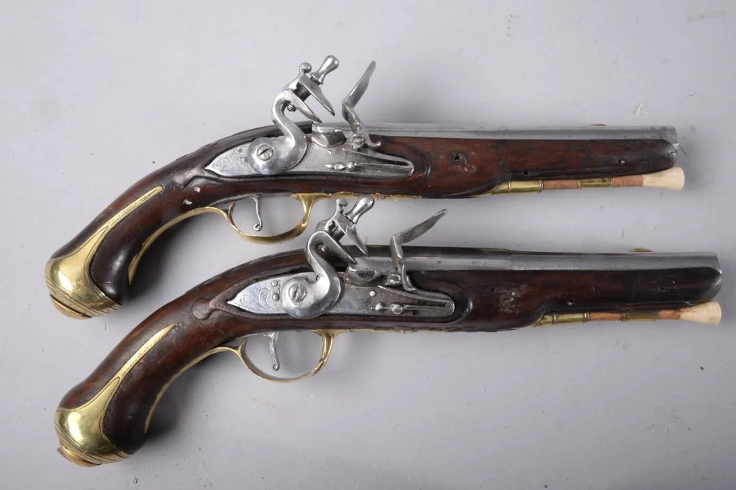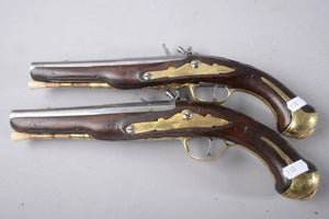 Paire de pistolets à platine à silex, contre-platine et garnitures en laiton, système d'armement fonctionnel à 2 crans, baguette à embout en corne, XVIIIe siècle, longueur: 33 cm