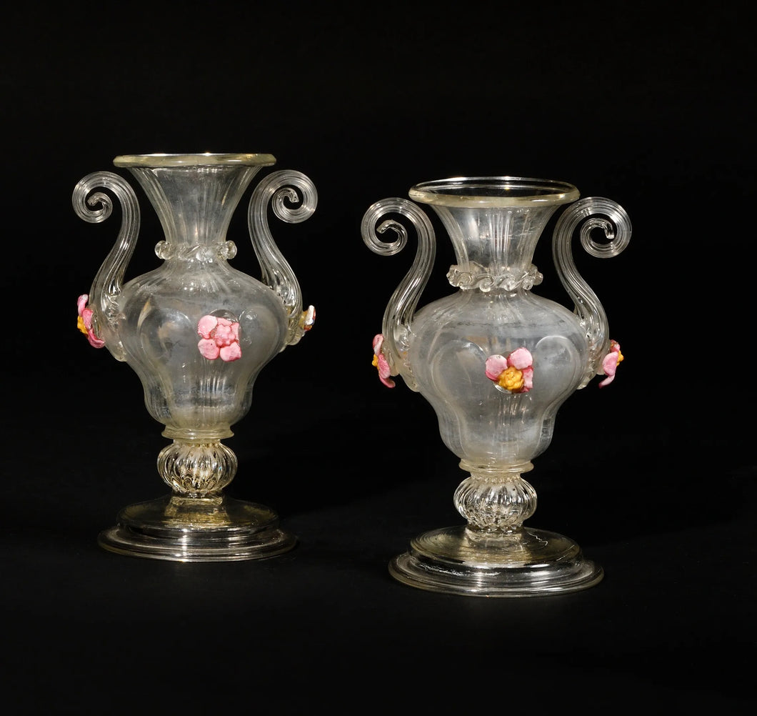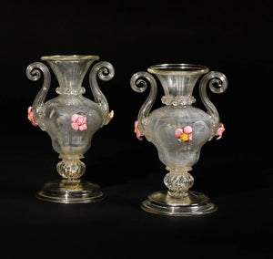 PAIRE DE VASES EN VERRE DE VENISE de forme balustre à décor de fleurs polychromes. Les anses en volutes. XVIIIème siècle Haut : 17.6 cm