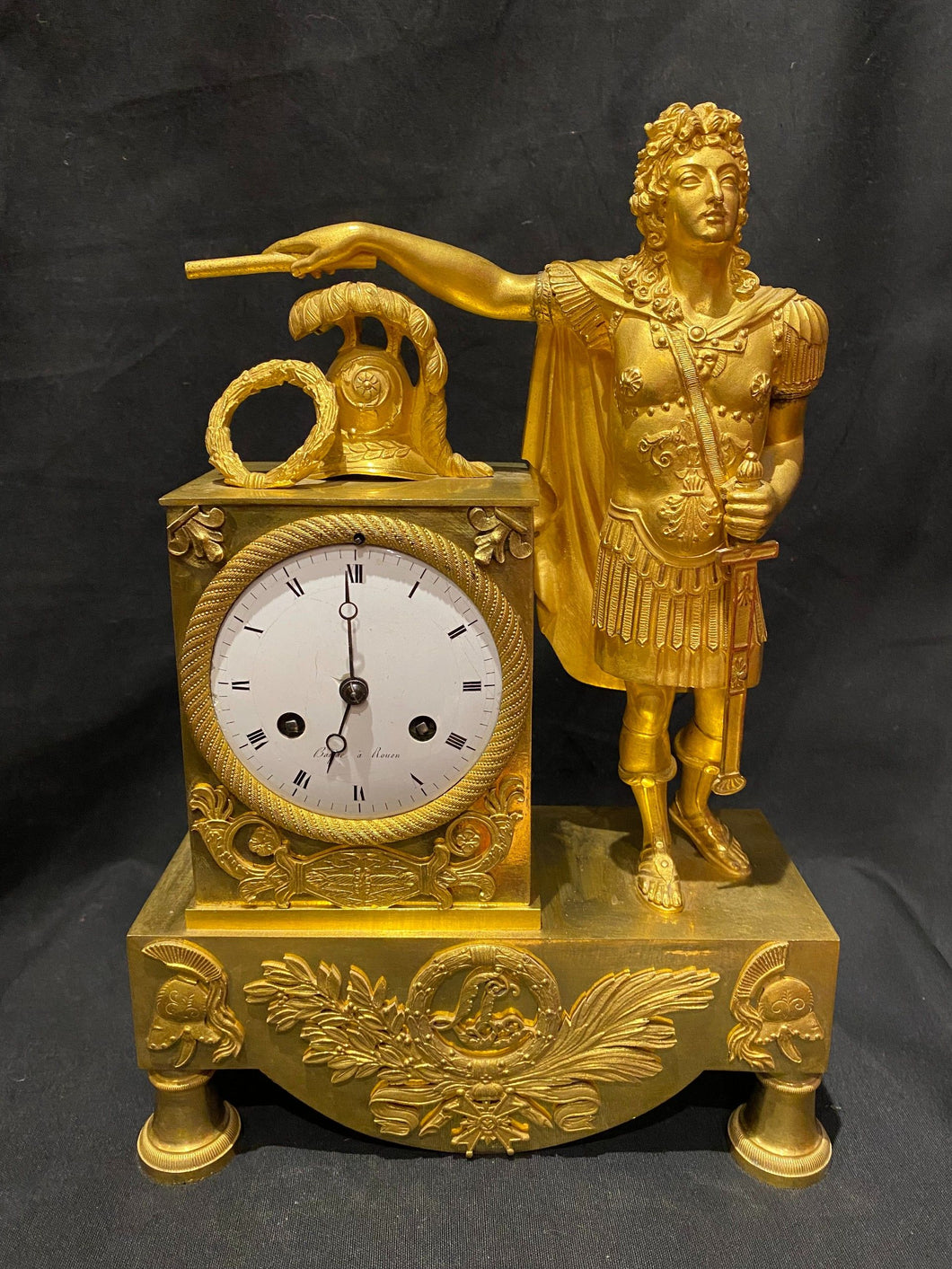 Pendule d'époque Restauration en bronze doré représentant Louis XIV dans ses habits d’Empereur avec son bâton de Maréchal au double L des Bourbons sur la terrasse et au dessus de la croix de l’Ordre de la fidélité. Signée de BARJAC à Rouen. Belle dorure d’origine. Ep.vers 1830. H.33 L.22 P.9.