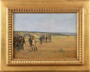 Général observant l’horizon avec ses aides de camp et fantassins en arrière-plan.