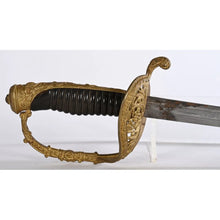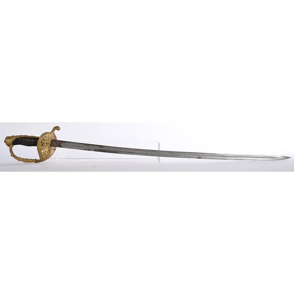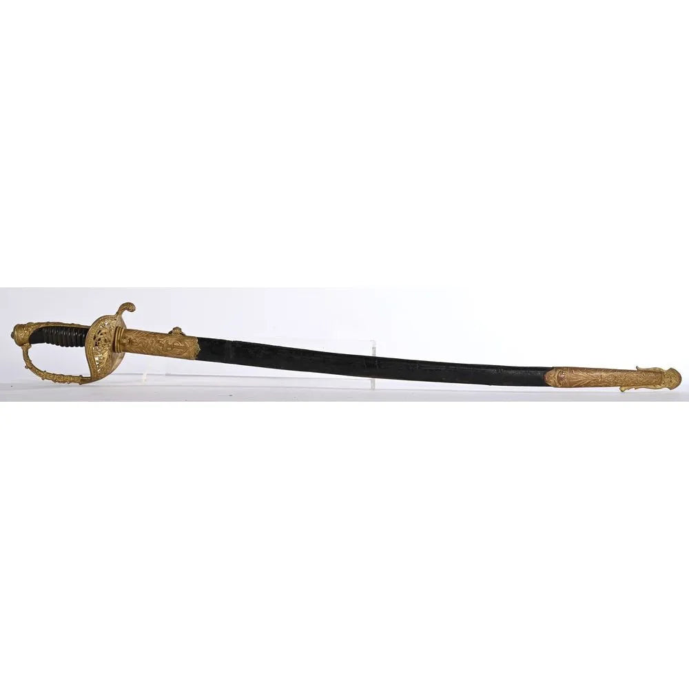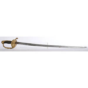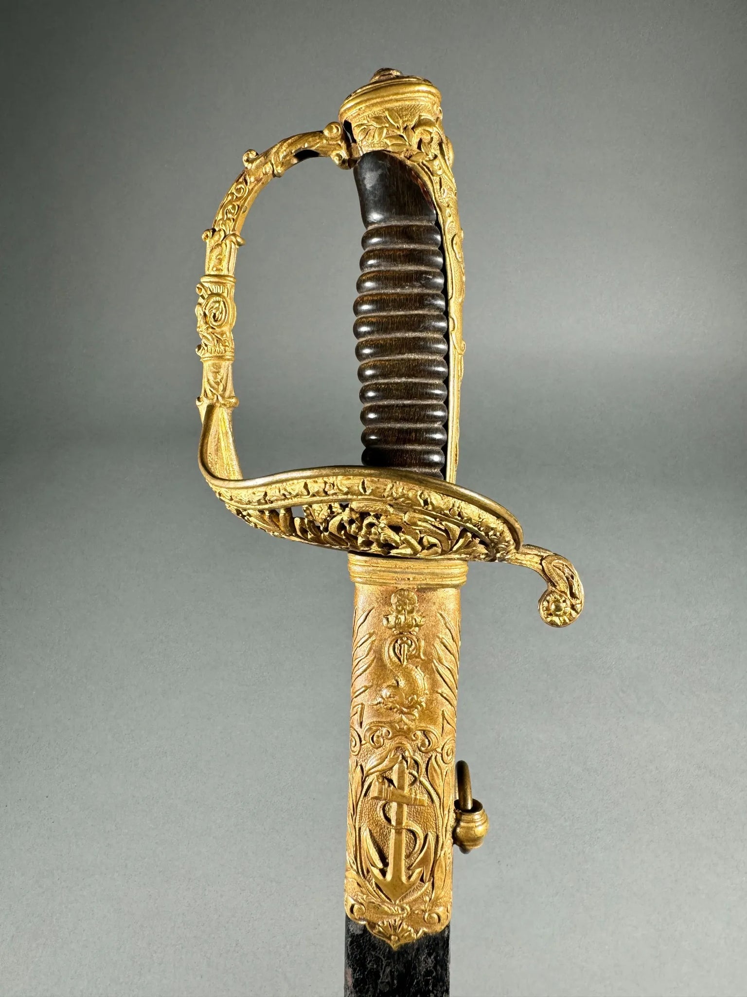 Sabre d'officier de Marine. Poignée en corne. Monture en laiton ciselé et doré. Calotte à longue queue. Garde à une branche à coquille ajourée à décor d’une ancre entourée de feuillages. Lame courbe à pans creux et gouttière. Fourreau en cuir à garniture en laiton. Chape à l’ancre surmontée d’un dauphin.