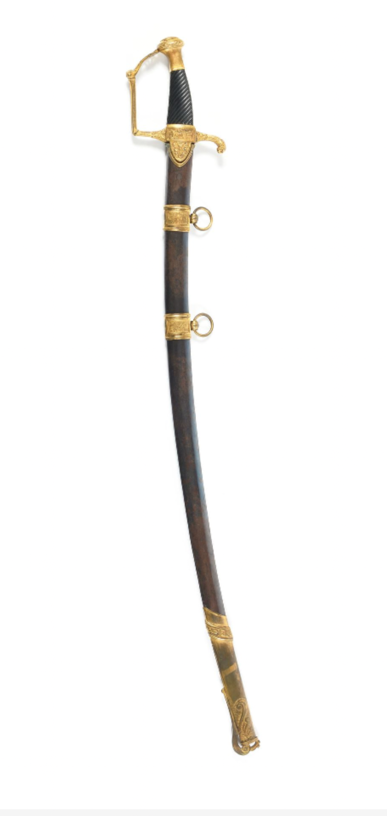 Sabre d'officier d'Etat Major type Vendémiaire an XII. Monture en laiton doré. Calotte ornée d’une frise de feuillages et d’une fleur. Garde à une branche décorée de feuillages et d’un mufle de lion. Poignée en ébène sculptée à canaux torses. Lame courbe. Fourreau en fer patiné. Époque Consulat - Ier Empire.