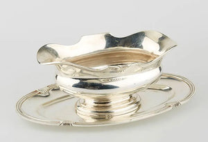 Saucière et son présentoir de forme ovale en argent à filets contours rehaussés de coquilles. Poinçon Minerve. Haut. : 8,5 cm. Long. : 26 cm. Prof. : 16 cm. Poids : 620 g.