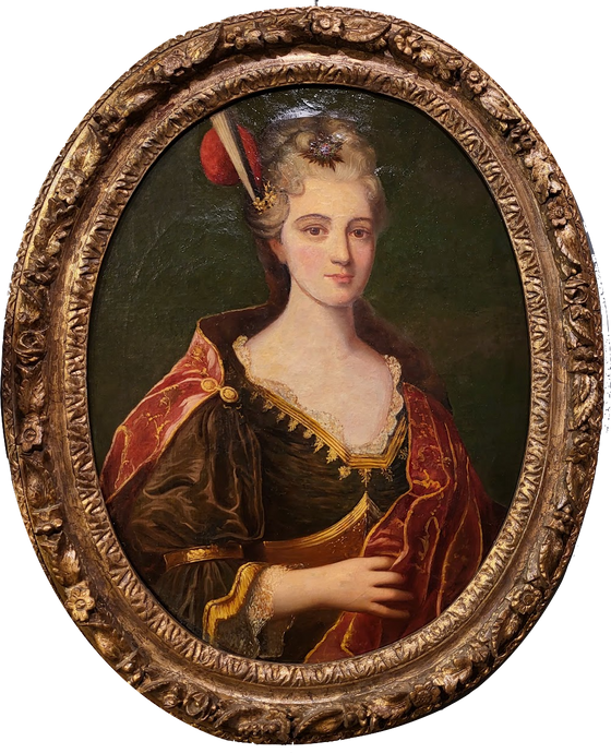 ÉCOLE FRANCAISE fin XVIIè. « Portrait présumé de la grande Mademoiselle, cousine de Louis XIV représentée en Diane chasseresse ».