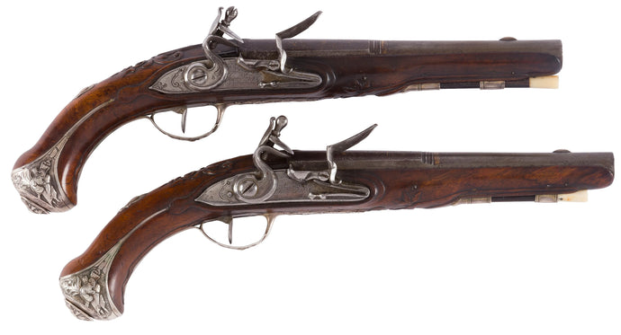 Paire de pistolets à silex d’officier. Canons ronds à pans aux tonnerres Vers 1760-1780.