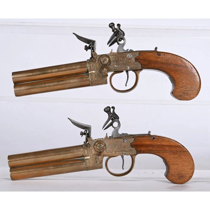 Pistolet double à silex. Canons ronds en table, gravés et décorés à l’or d’éclairs