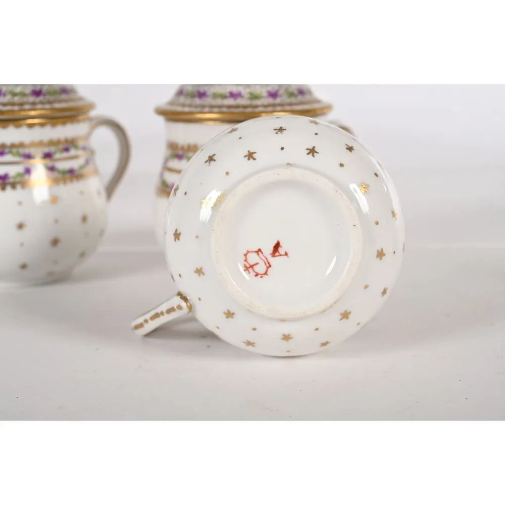 6 PETITS POTS A CRÈME en porcelaine de PARIS provenant de la Manufacture de Marie-Antoinette. Marque au « A » couronné pour la Manufacture de la Rue de Thiroux. Ep.fin XVIIIè.