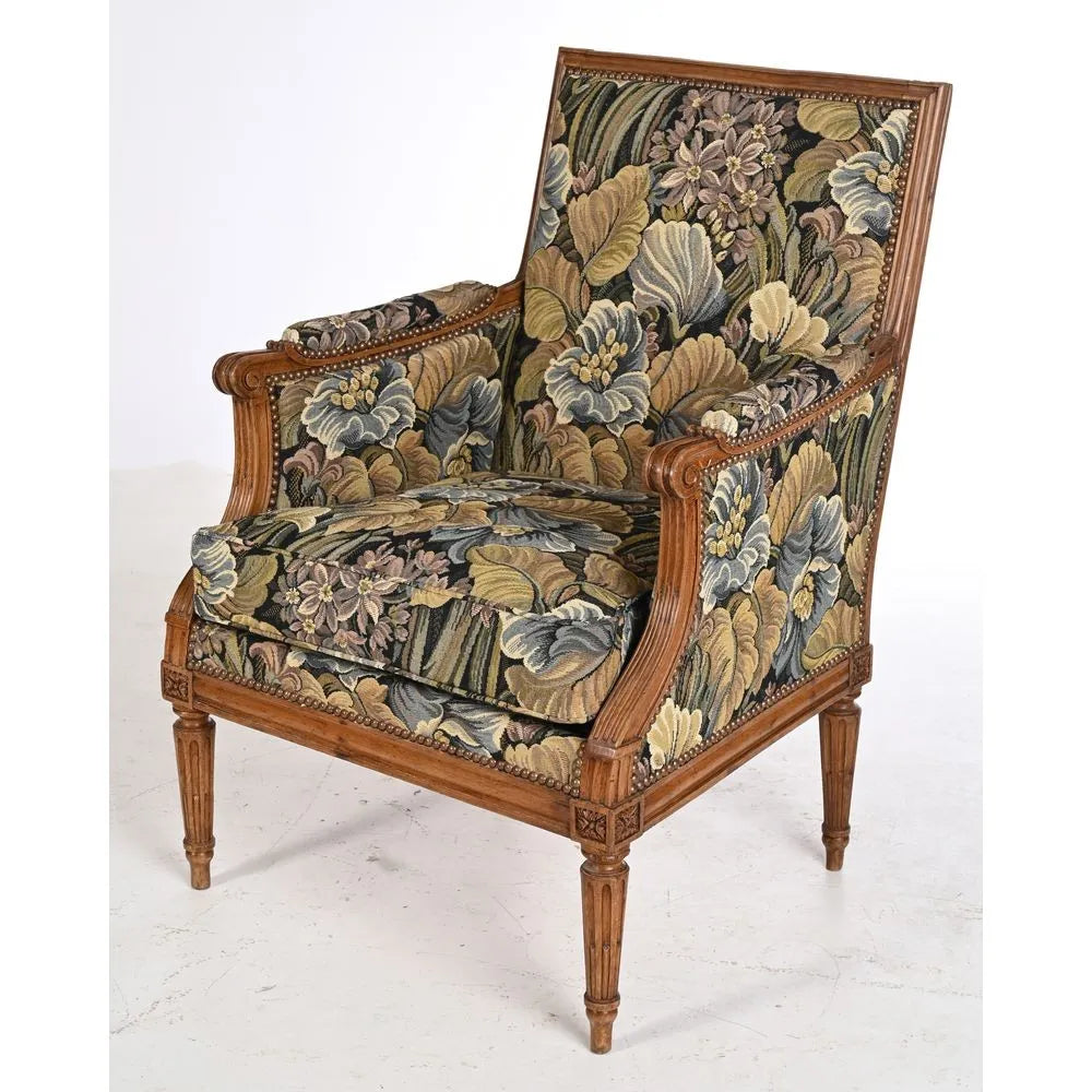 BERGERE LOUIS XVI en hêtre mouluré. Dossier carré. Accotoirs à enroulements manchette. Pieds fuselés à cannelures et pointes d’asperges. Travail parisien d’époque XVIIIè.