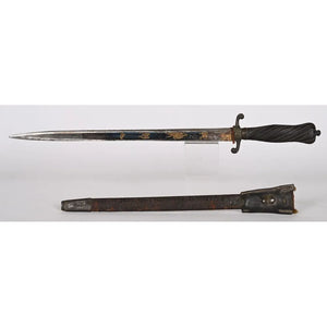 Dague de chasse Louis XV à poignée en ébène torsadé souligné de filets. La lame est bleuie à décor de trophée d’armes et de fleurs. Avec son fourreau en cuir. Ep.XVIIIè. L.52.
