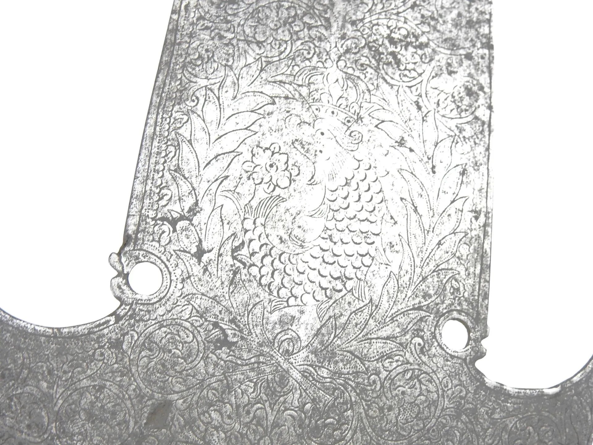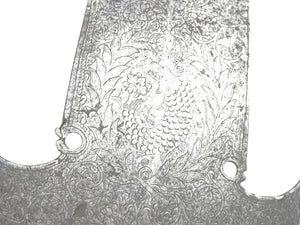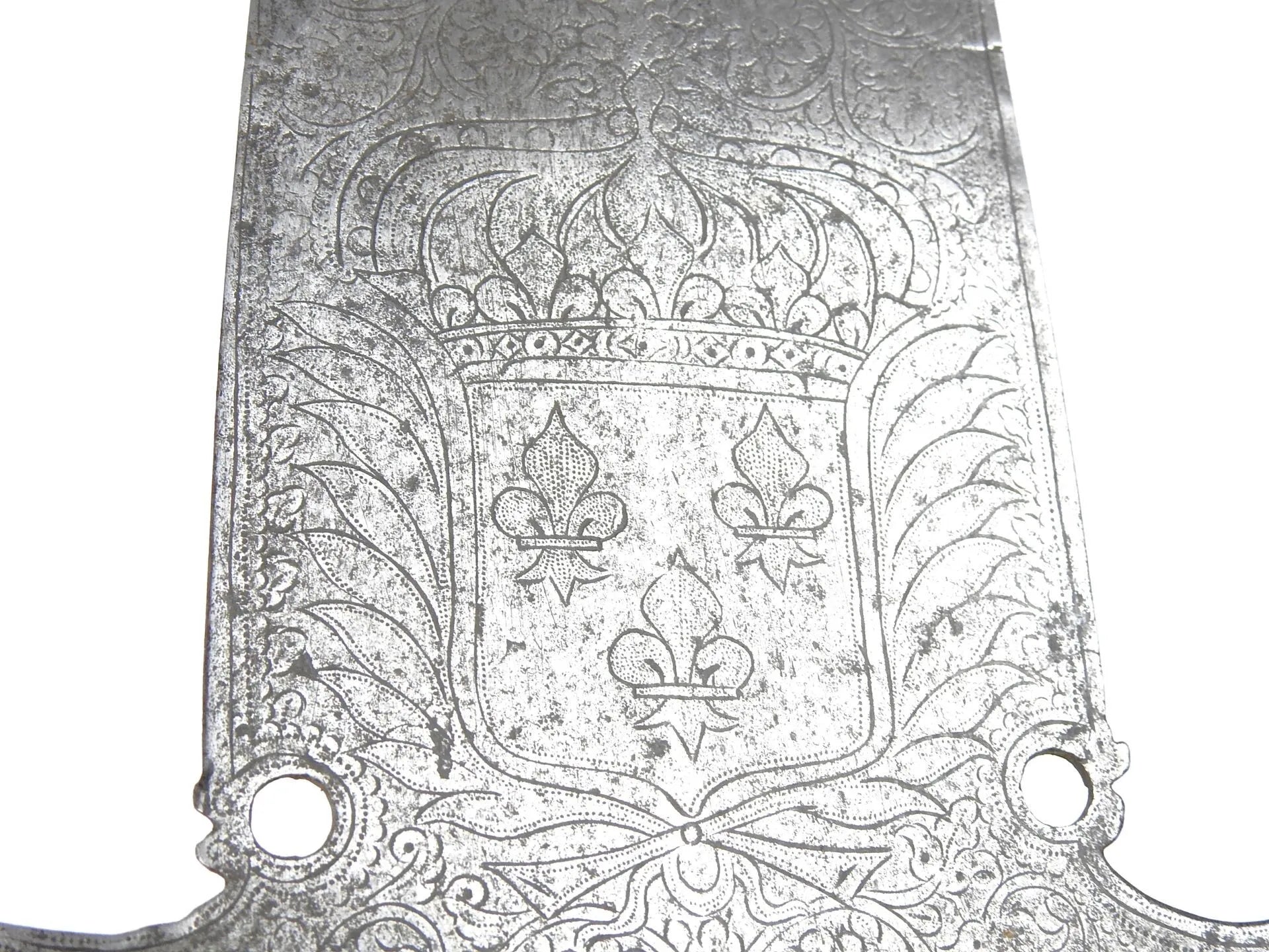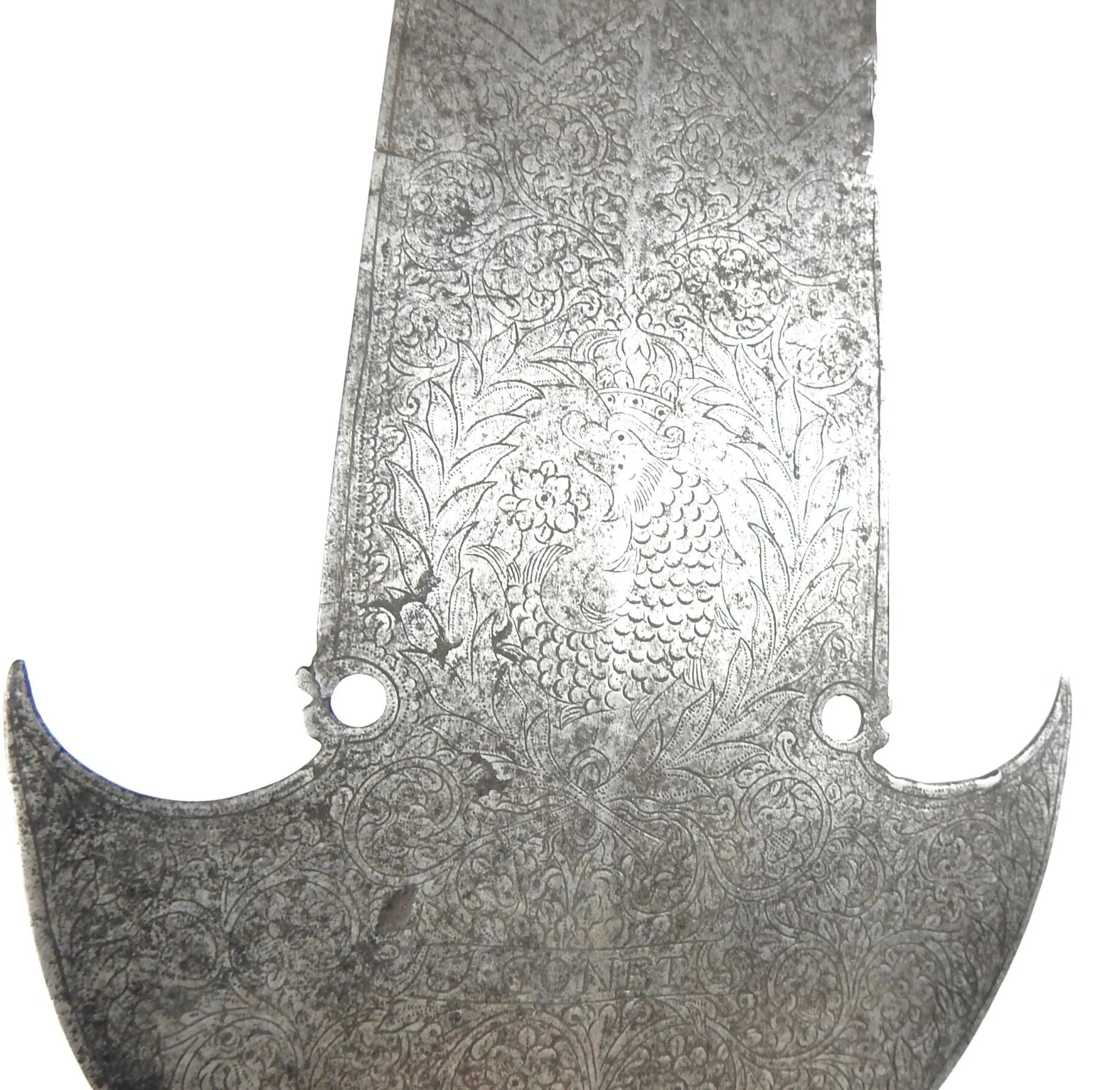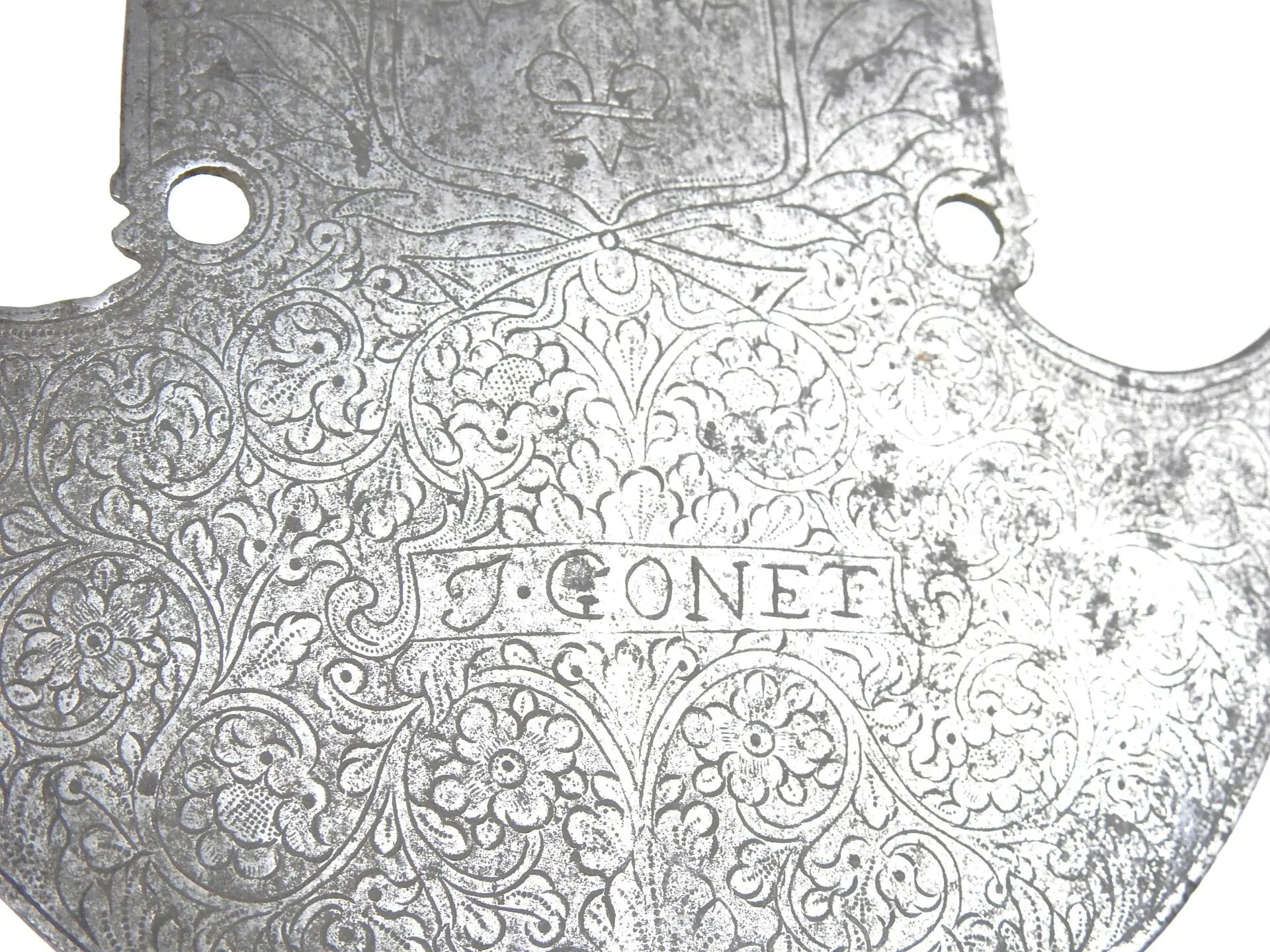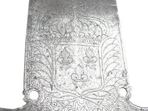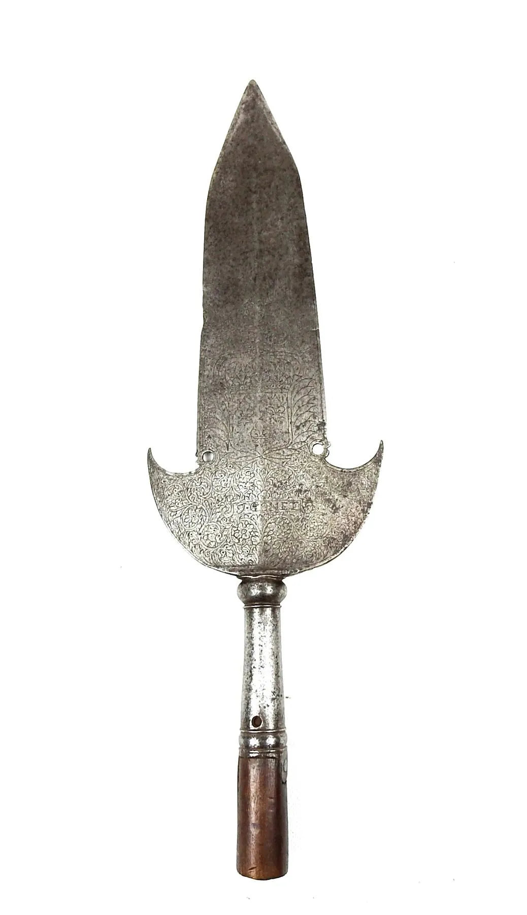 FRANCE. Fer de pertuisane gravé sur une face des armes de France et de motifs floraux, signée "J. GONET" dans un cartouche, au dos d'un dauphin couronné et de décors similaires. 44 X 15 cm. Epoque Louis XV. Sans doute provenant du régiment du Dauphin créé en 1667.