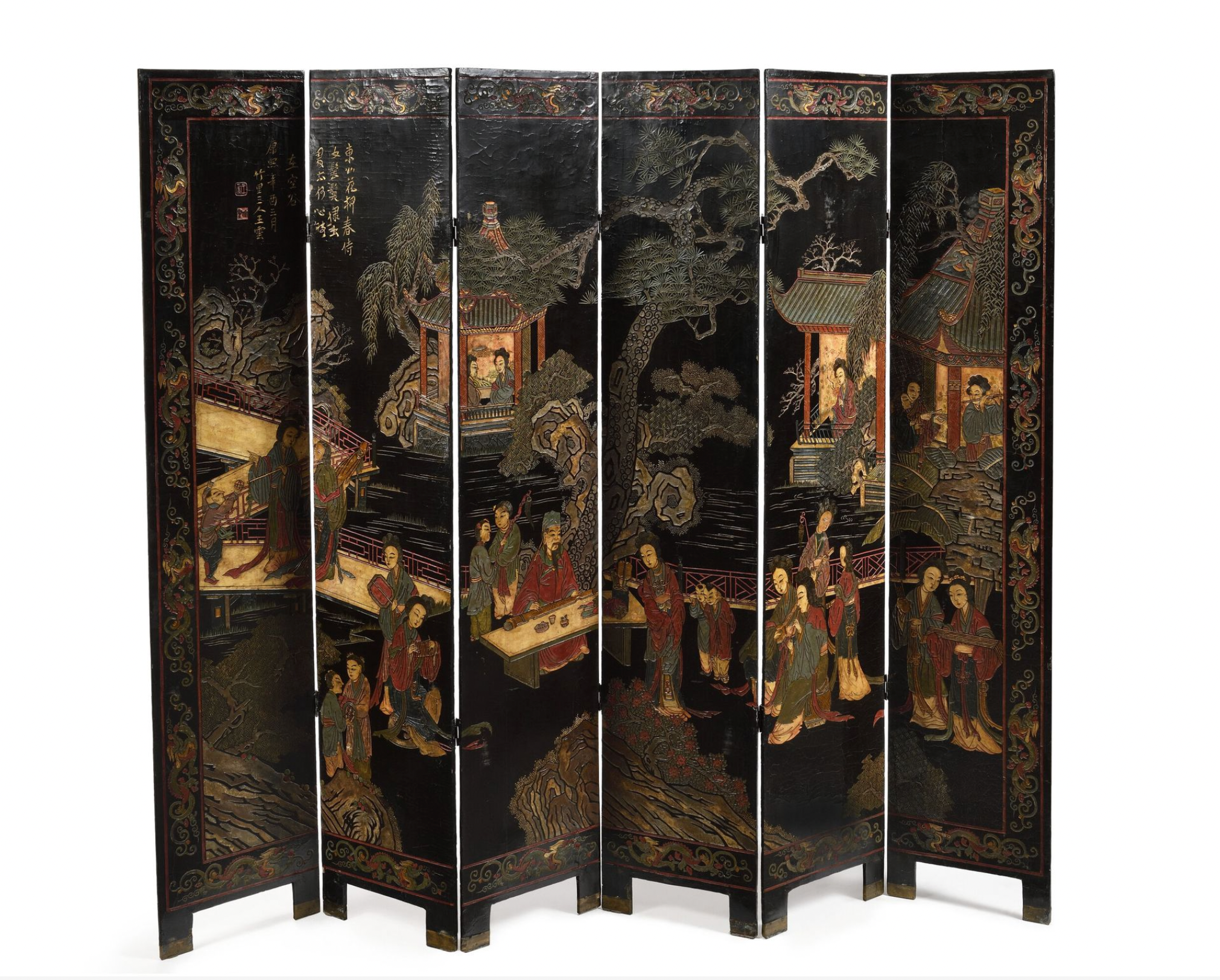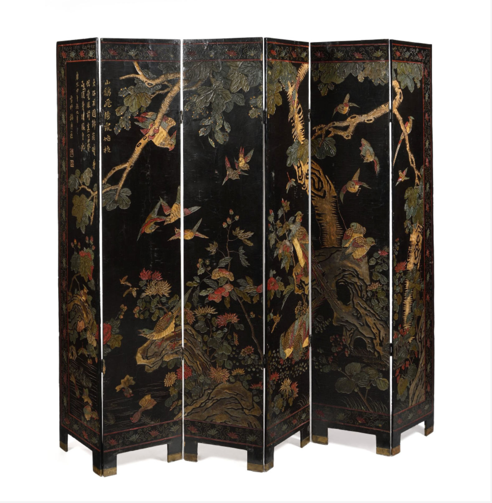 Grand paravent à six feuilles Ep XVIIIe en laque de Coromandel, à riche décor, pour un coté, de scènes animées en extérieur dans des réserves aux dragons et poème de Li Po et de l'autre d'oiseaux branchés dans des réserves fleuries. Fin du XVIIe, début du XVIIIe siècle. Feuille. 210,5 x 40,5 cm