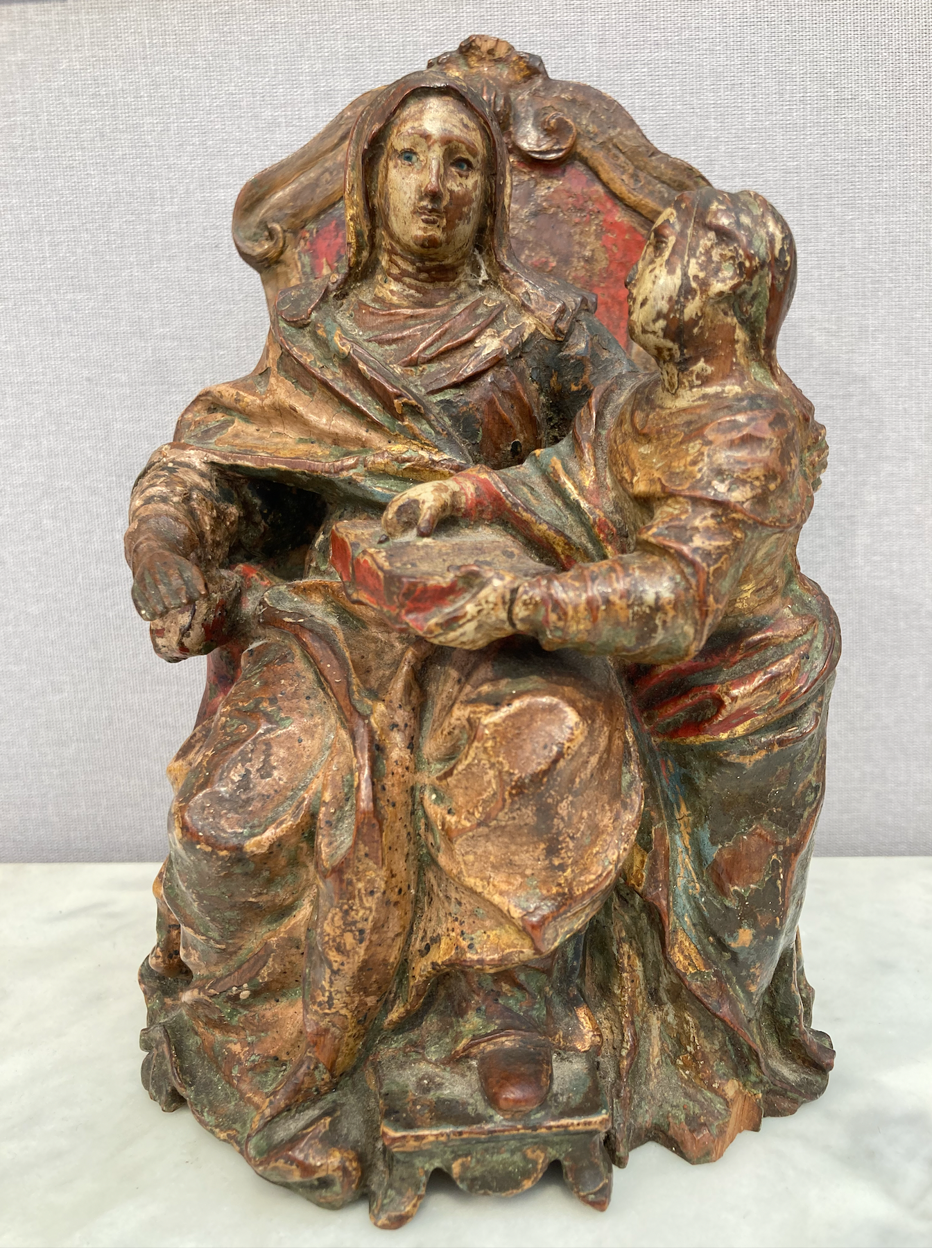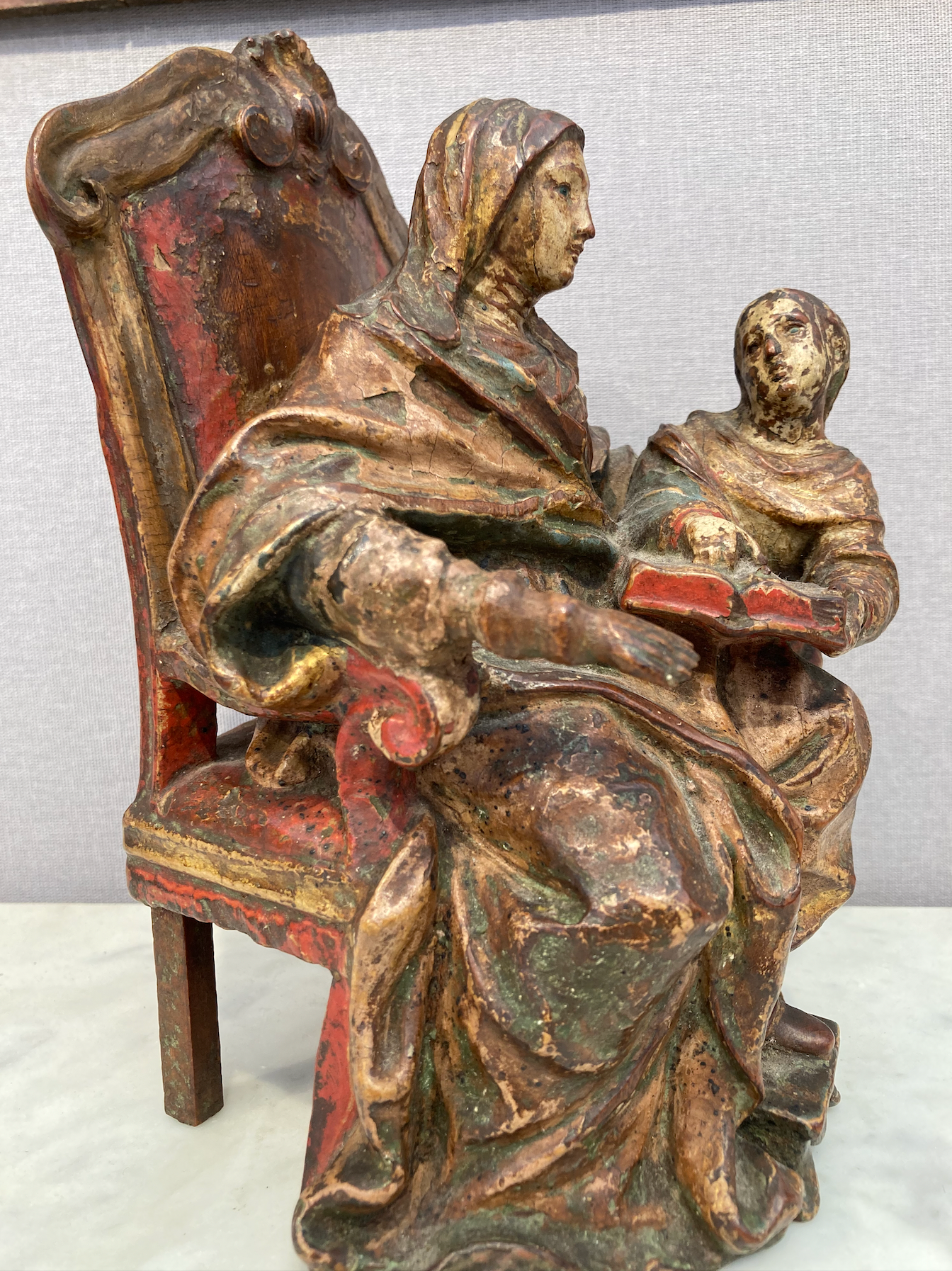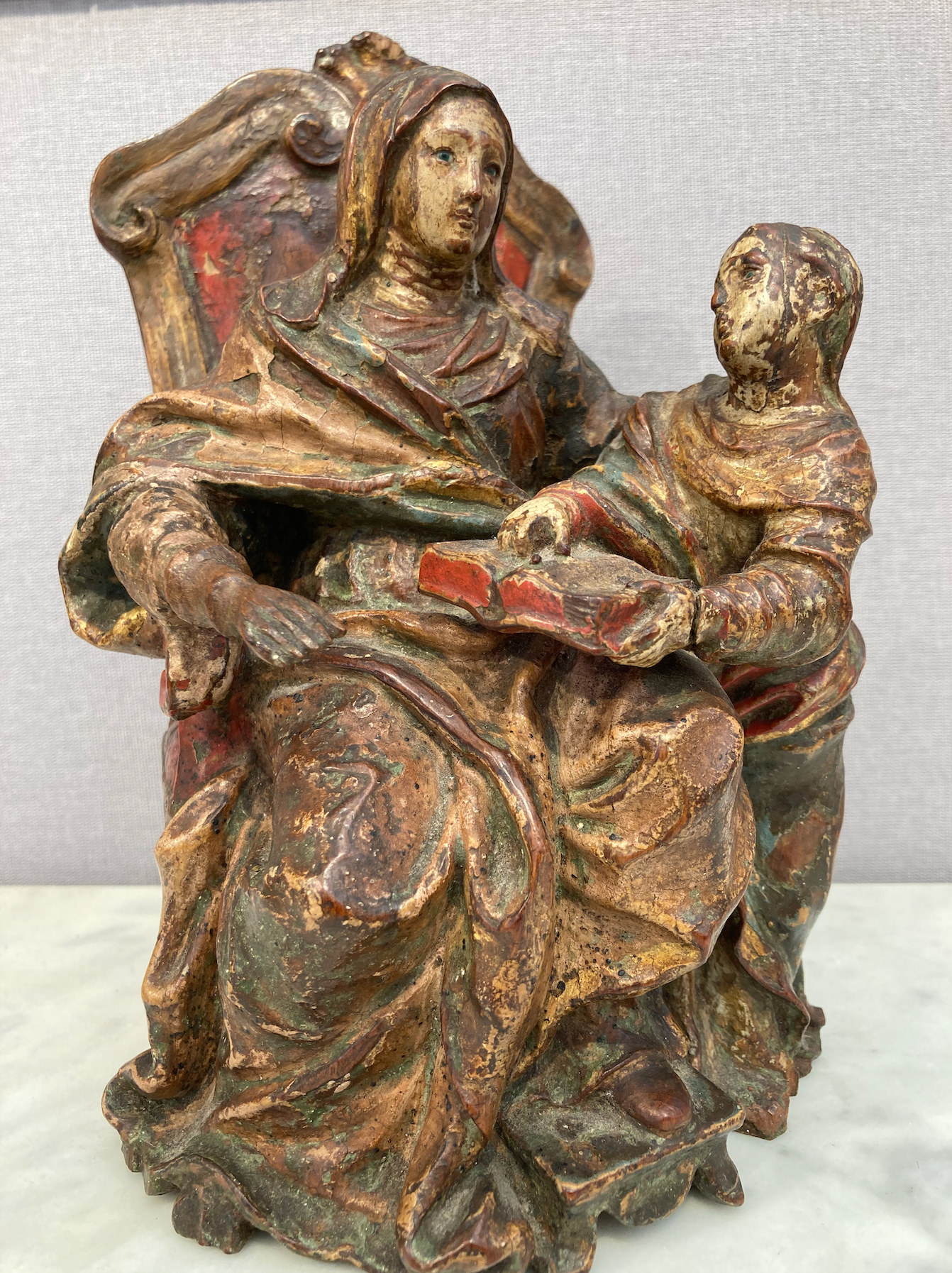 ITALIE, Fin XVIle, "L'Éducation de la Vierge par sa mère sainte Anne " précieux groupe en bois sculpté polychrome. Sainte Anne est assise sur un grand fauteuil d'apparat à haut dossier avec un livre ouvert sur ses genoux. Ses pieds reposent sur un tabouret. Marie debout sur la gauche de sa mère tient de sa main gauche les Saintes Écritures; de son index, droit semble indiquer une chose. Elles sont toutes deux vêtues d'une longue tunique et d'un long voile aux lourds plissés.