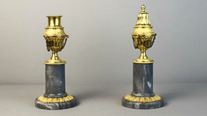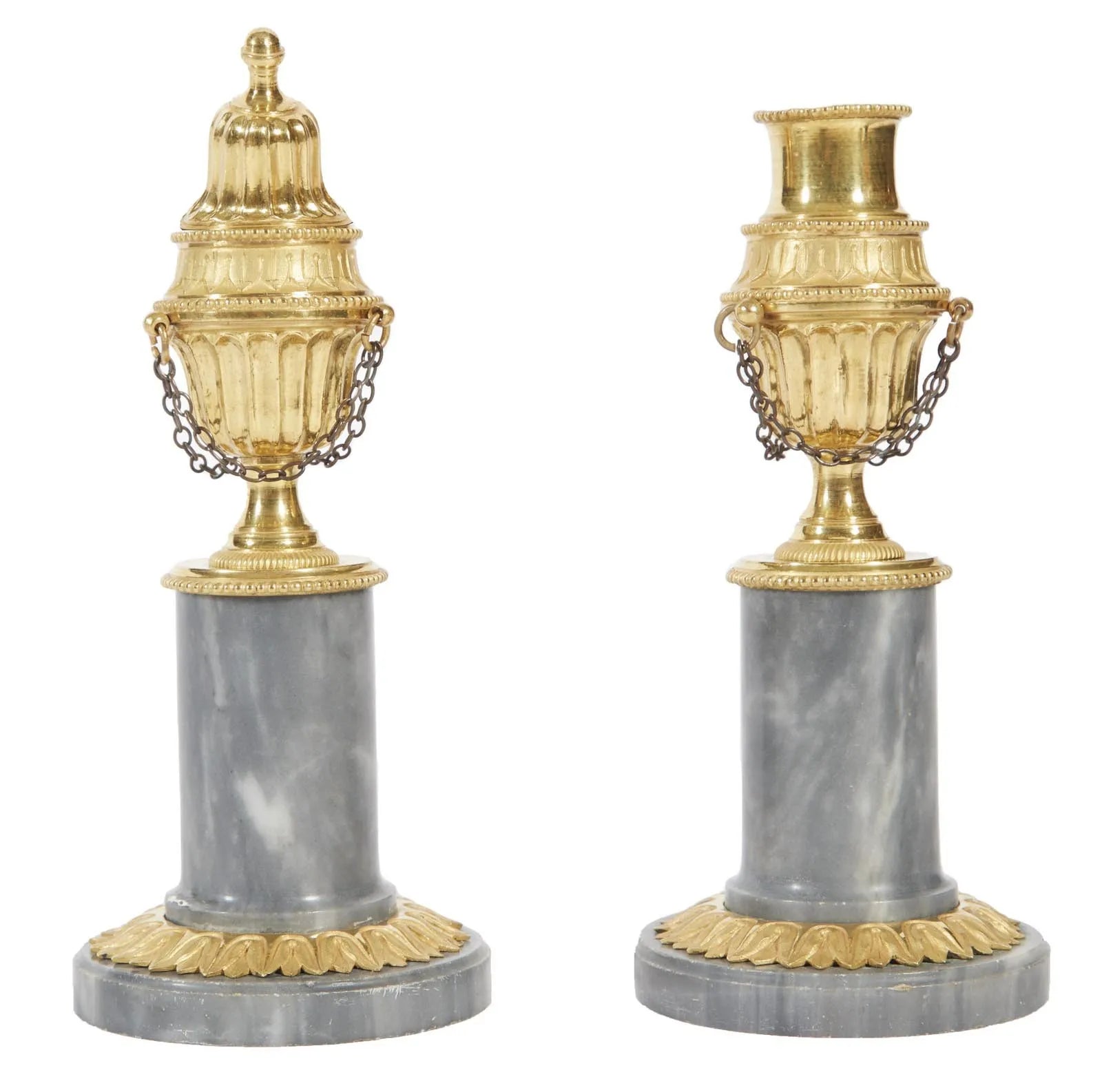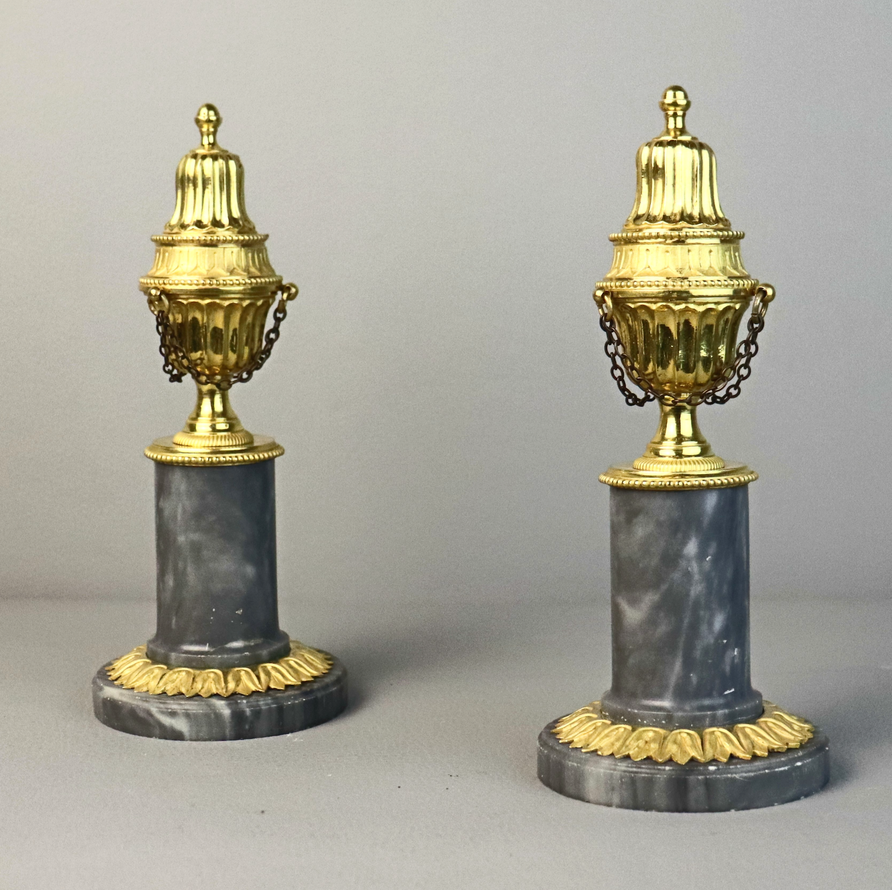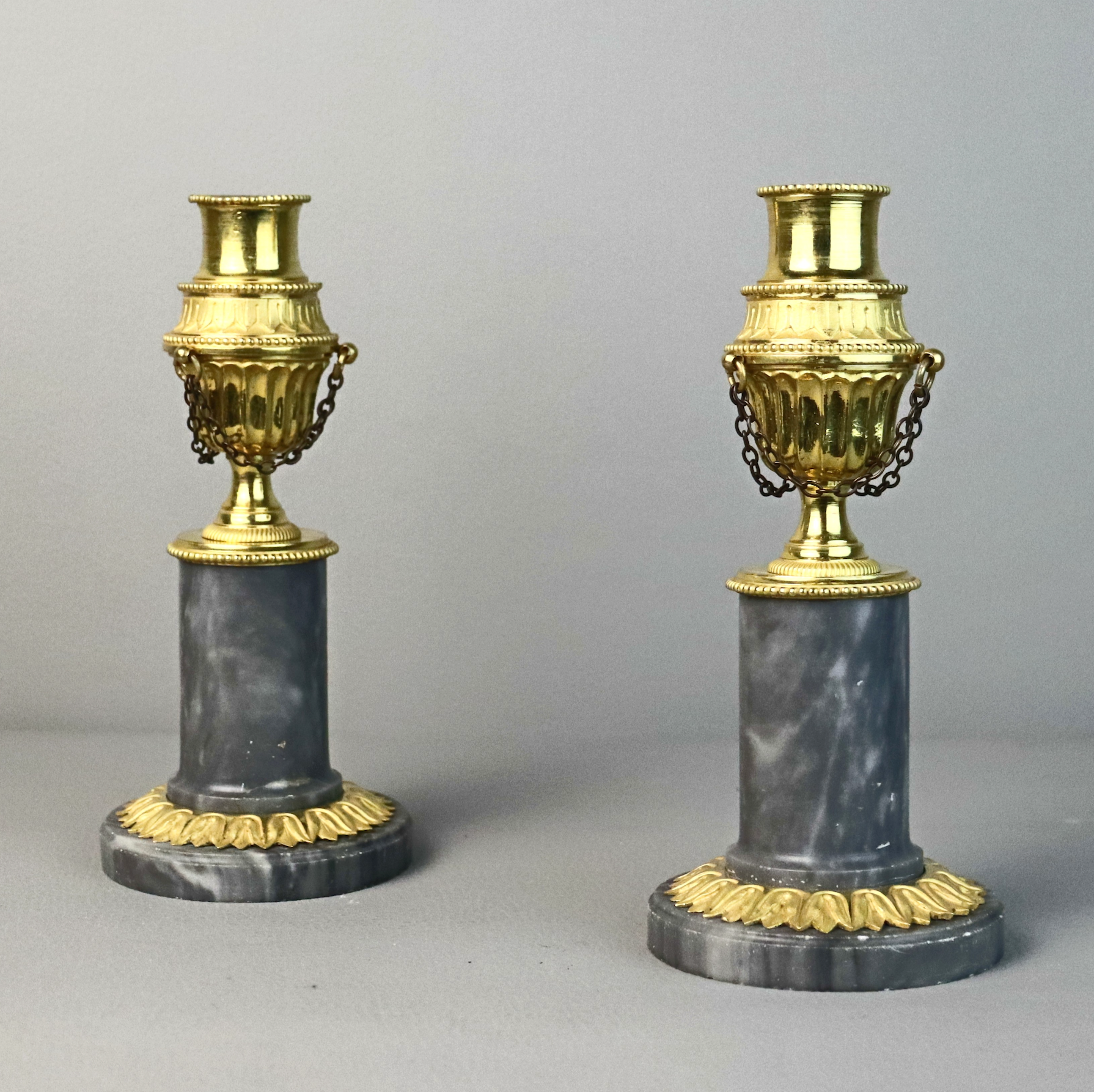 Paire de bougeoirs cassolette en bronze ciselé et doré et marbre bleu turquin à décor de vase sur pièdouche souligné de chainettes Décor ciselé de frises de canaux et frises de raie-de-coeur fin XVIII H 20 cm