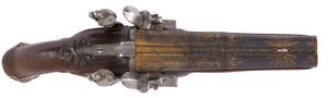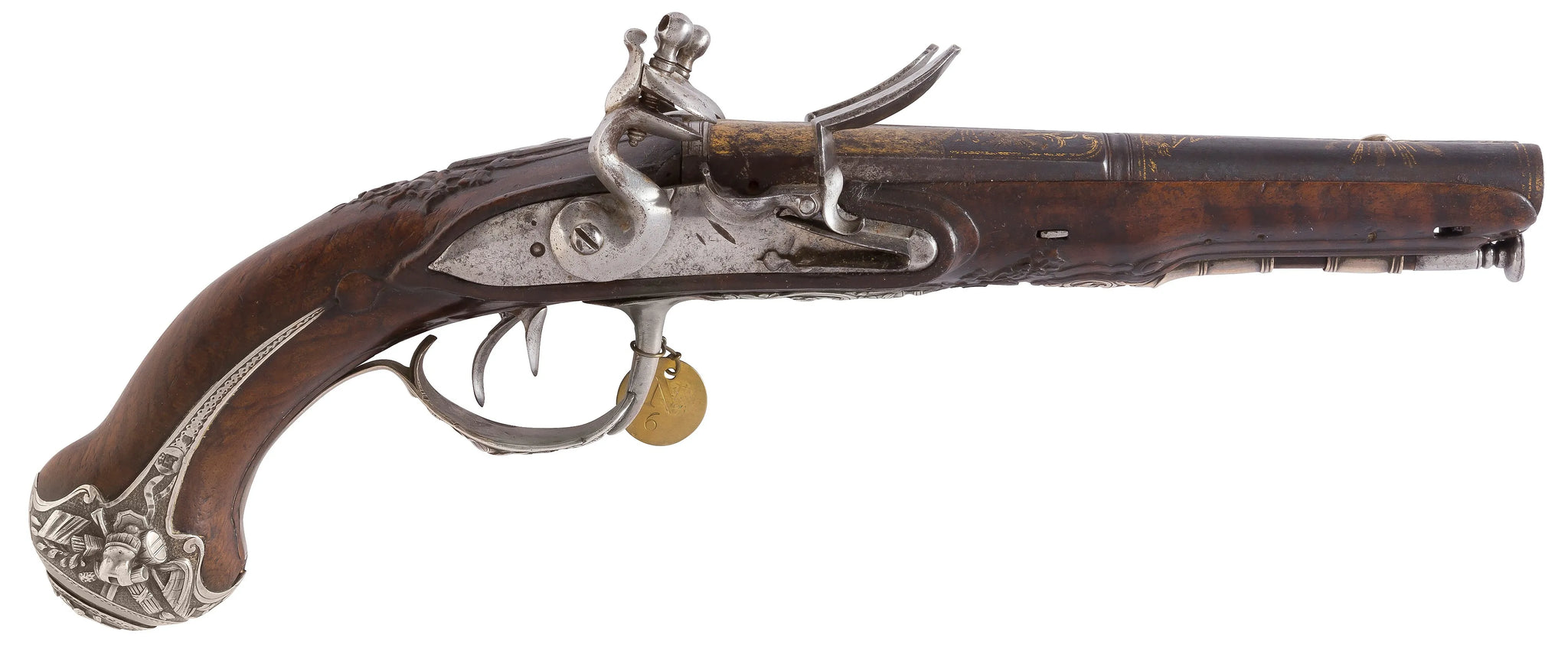 Pistolet double à silex. Canons ronds en table, gravés et décorés à l’or d’éclairs et de feuillages, marqué sur la bande « Tordu ». Platines et chiens col de cygne à corps ronds. Bassinets ronds en acier. Belles garnitures en argent, ciselées en fort relief à décor de feuillage et trophées d’armes. Pommeau à longues oreilles, poinçonné. Crosse en noyer en partie sculptée autour de la queue de culasse. Poinçonné « F » sous couronne, « Paris 1747 » et « L ». Longueur : 32 cm A.B.E. Epoque Louis XV. Porte une étiquette de collection en laiton « N6 ».