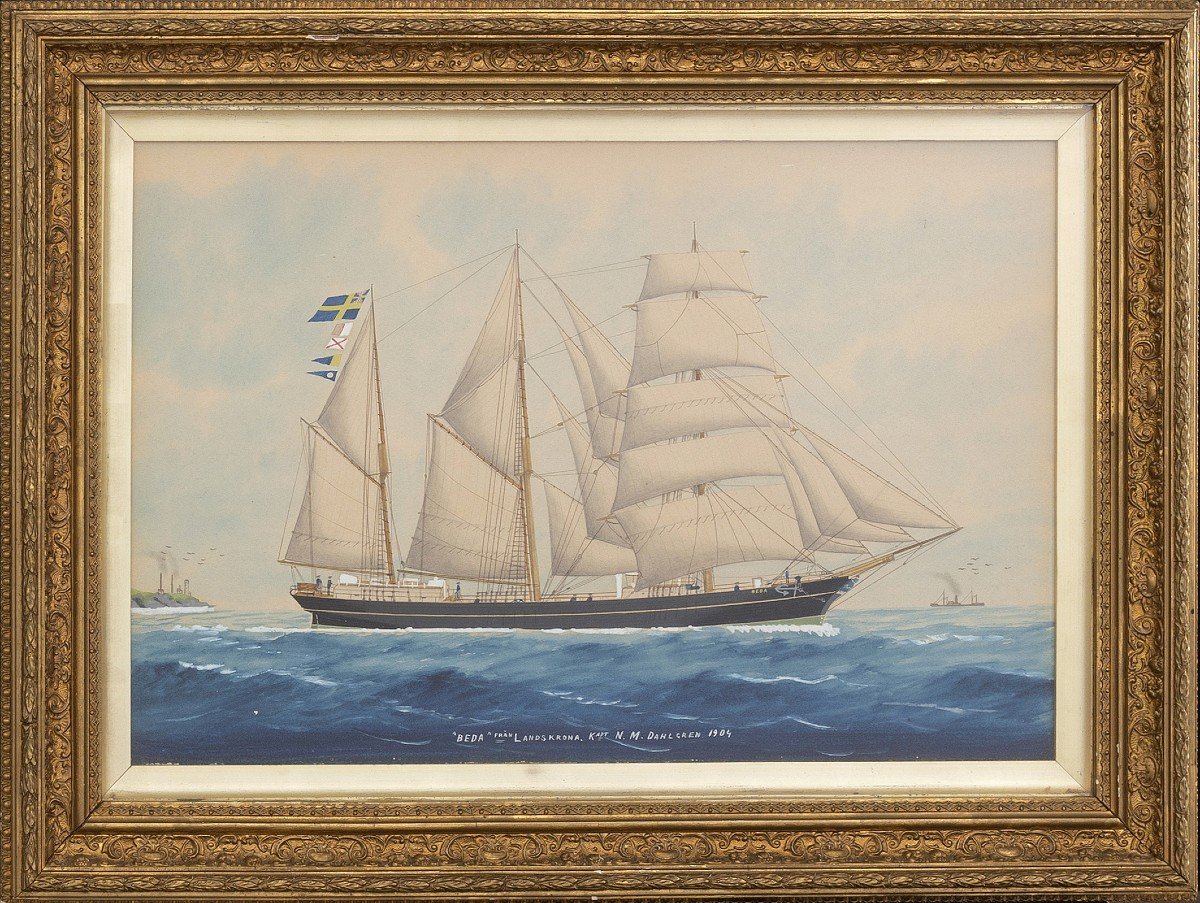 "Portrait d’un brick, Reuben Chappell (1870-1940) Attr." Très belle aquarelle et gouache, datée en bas au centre et attribuée au célèbre portraitiste de bateau britannique, Reuben Chapell. 1904