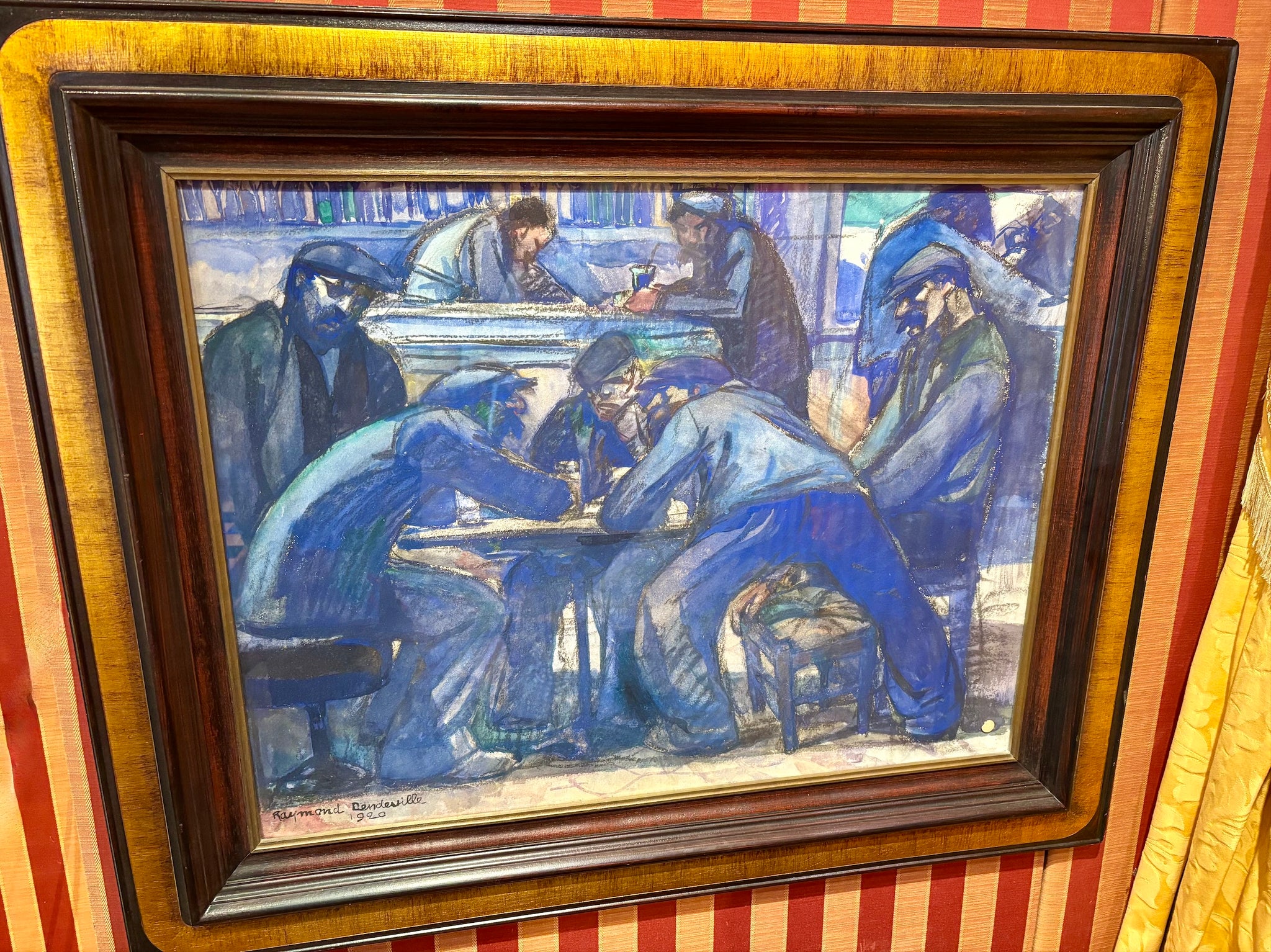 Cette aquarelle de 1920, signée de la main de Raymond Dendeville, représente une scène de bistrot baignée de nuances de bleu, du bleu grisé au bleu profond.